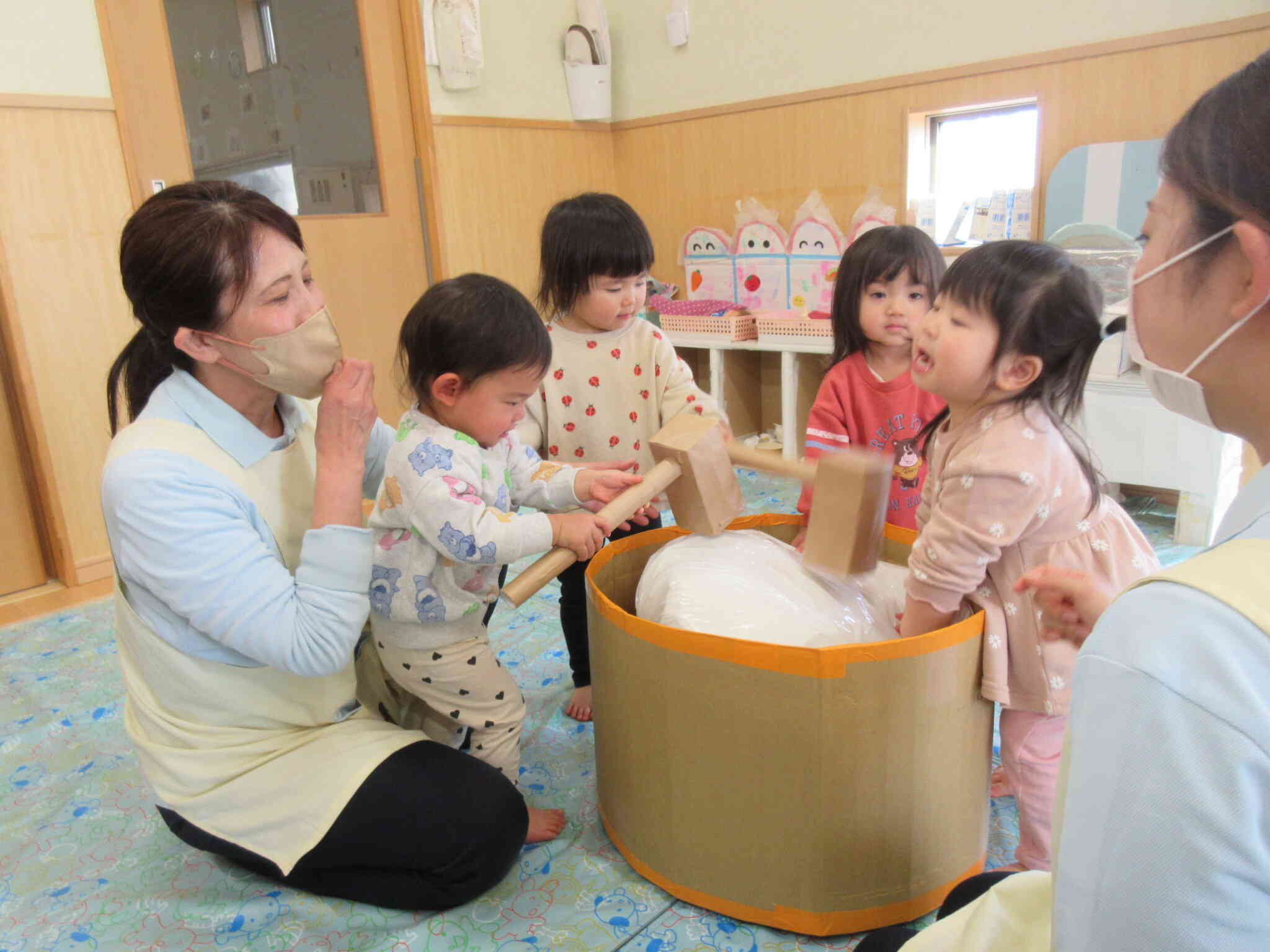調理師さんがお餅に見たてた小麦粉粘土を届けてくれて・・