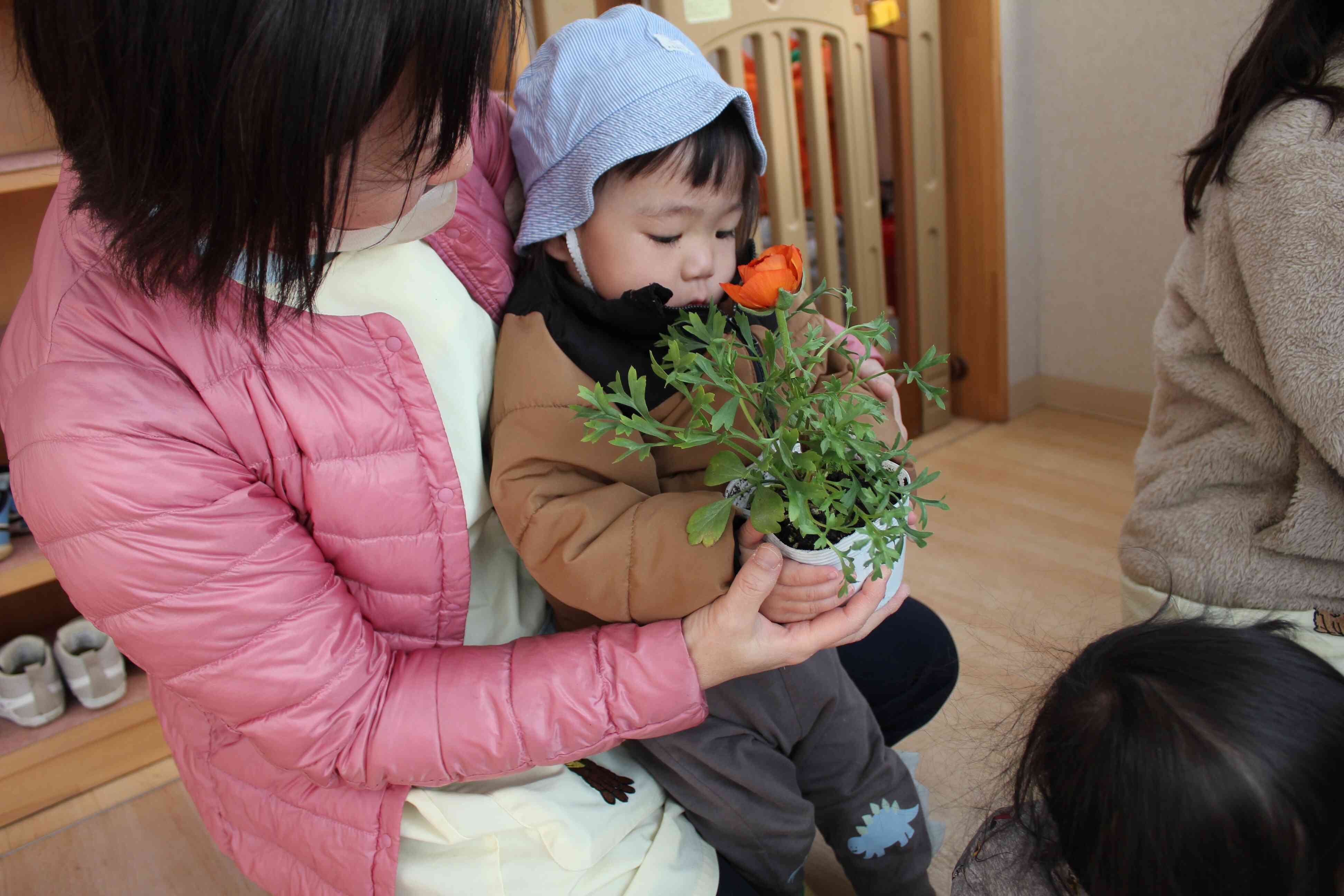先生と一緒に0歳児さんもお花を植えました。