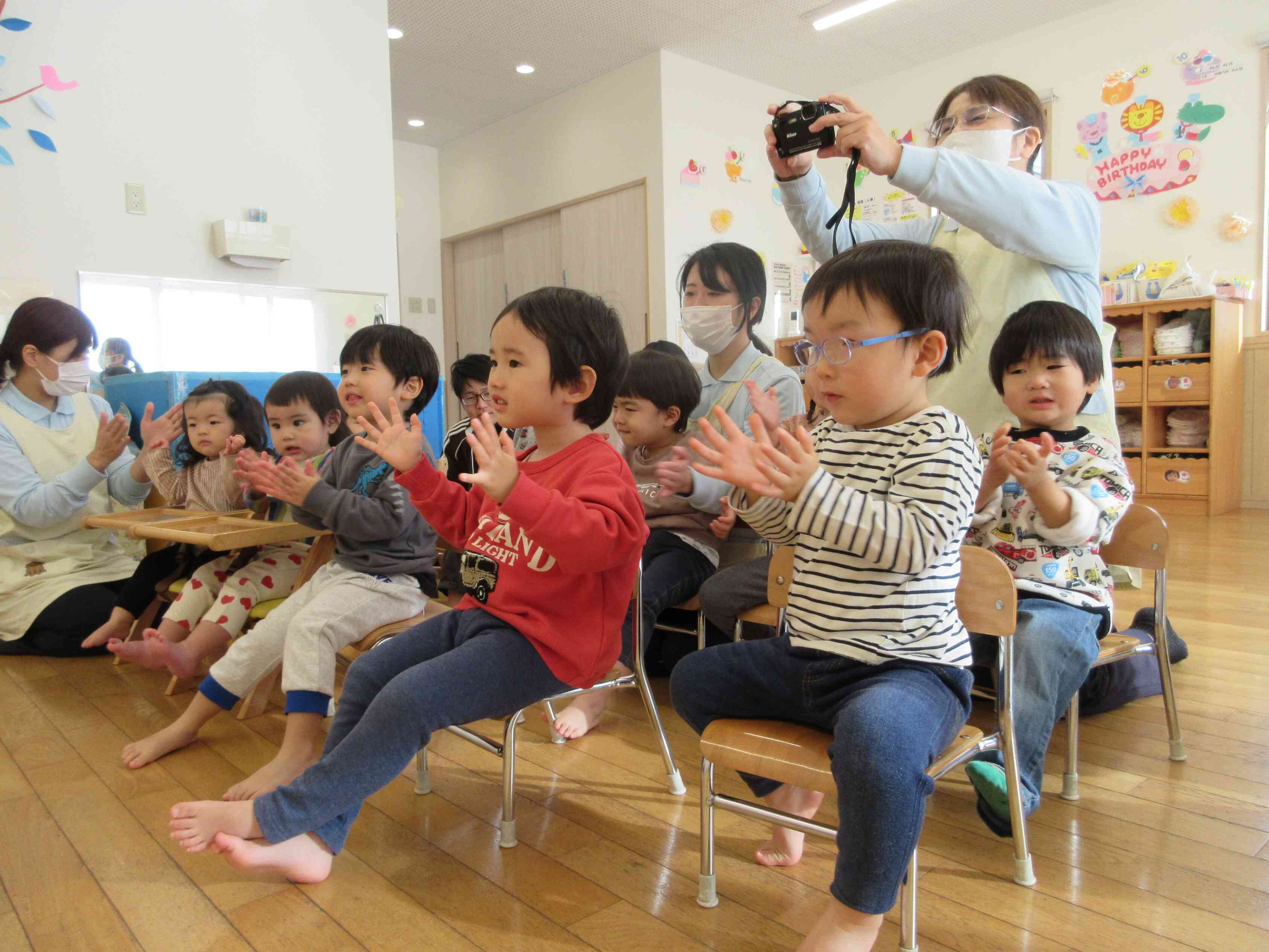 手拍子をしながら大きな声で歌っています♪