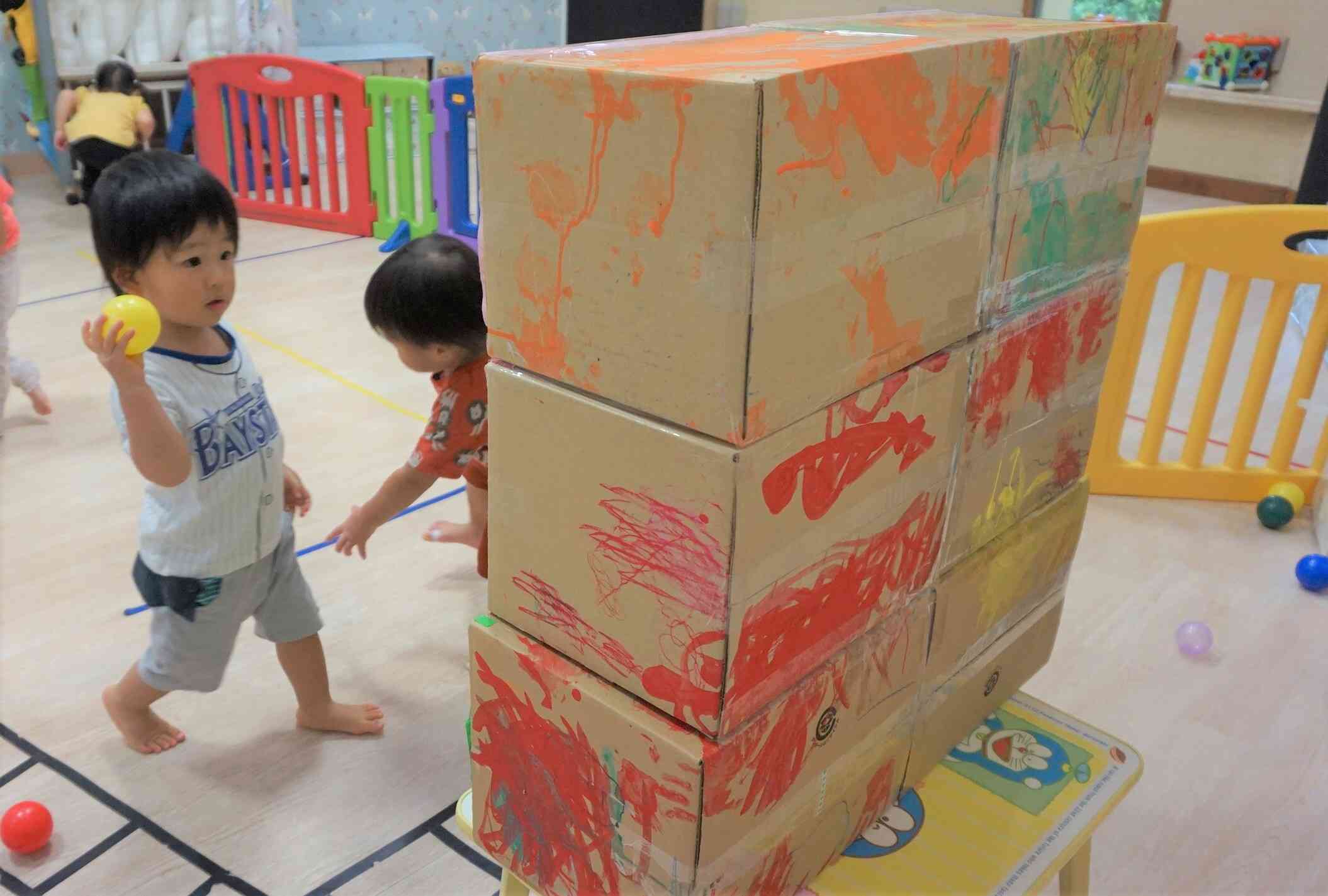 みんなでお絵かきや色塗りをしたダンボールが的当てに大変身☆