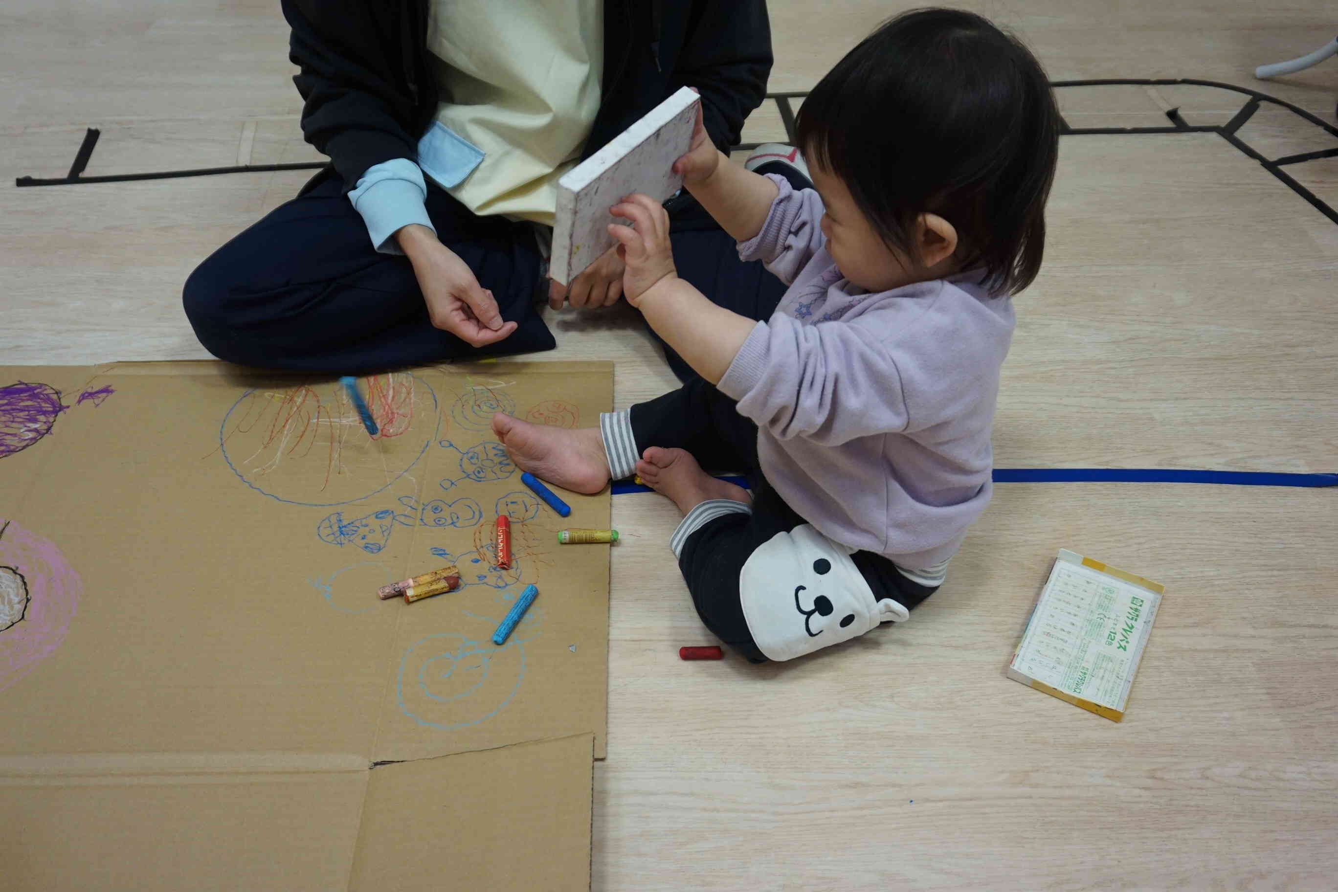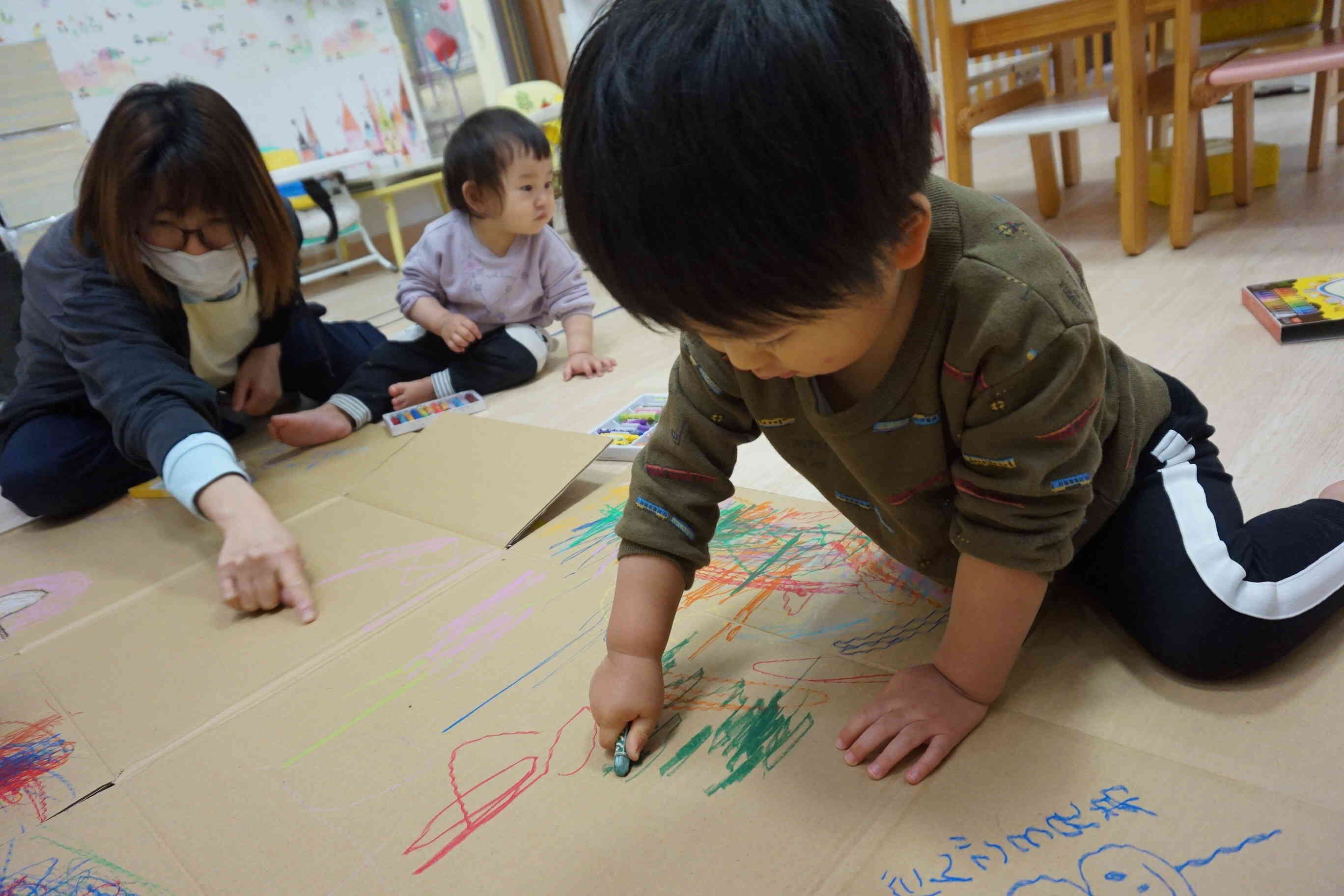 大きなダンボールにクレヨンでラクガキ♪