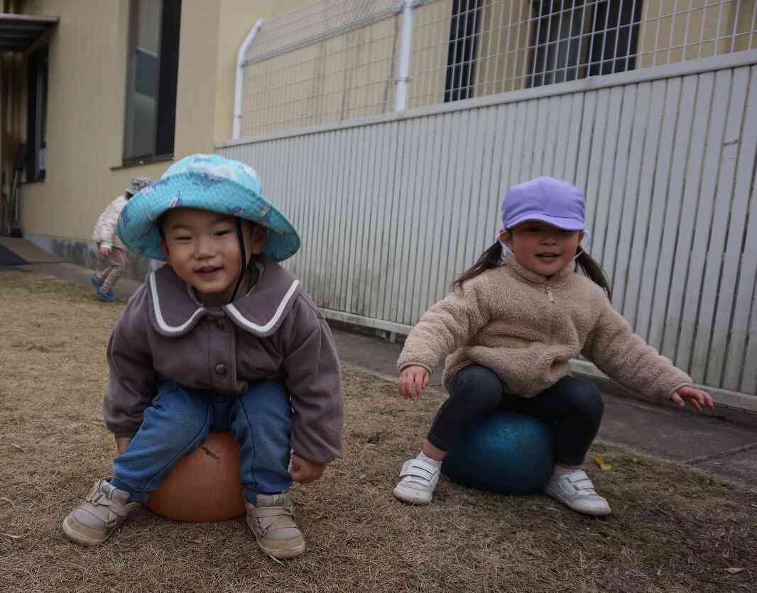 お友だちが大きいボールに座ってぼよんぼよんと跳ねるのを楽しんでいる様子も見てみんな真似っこ☆