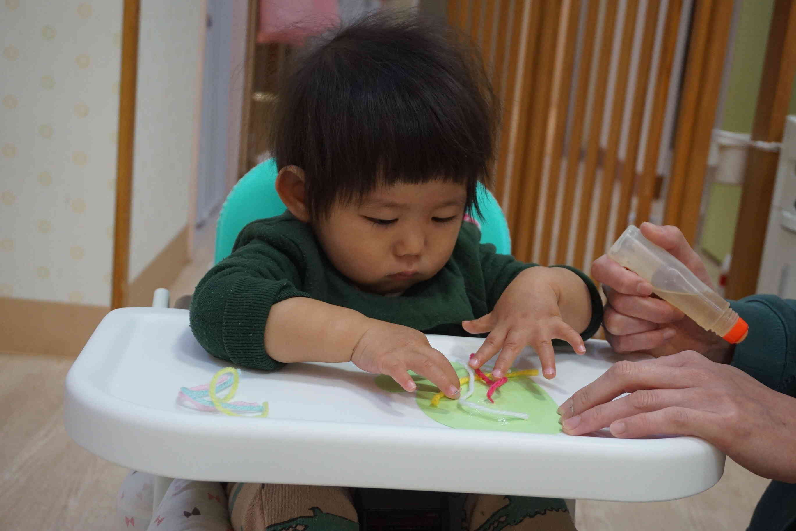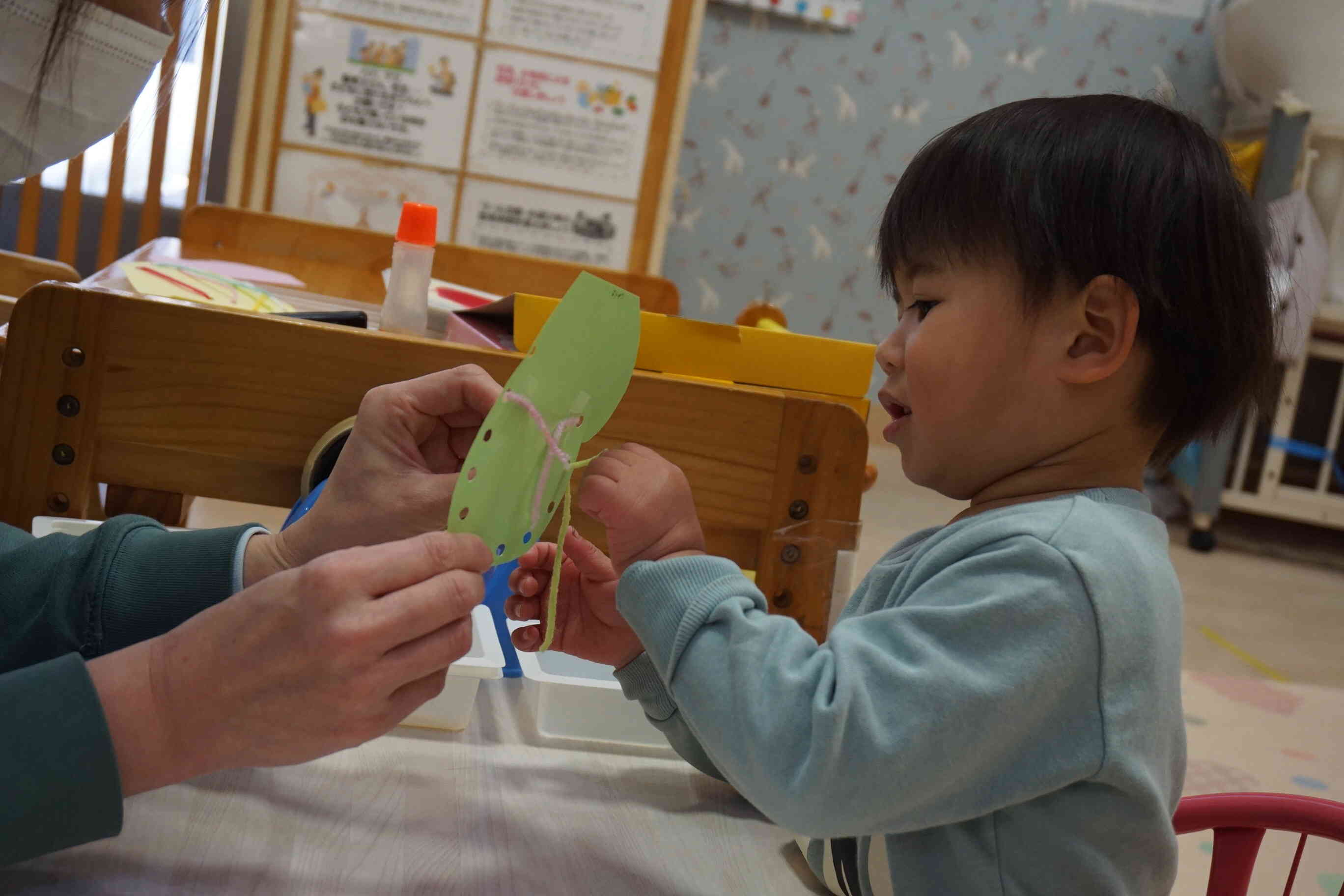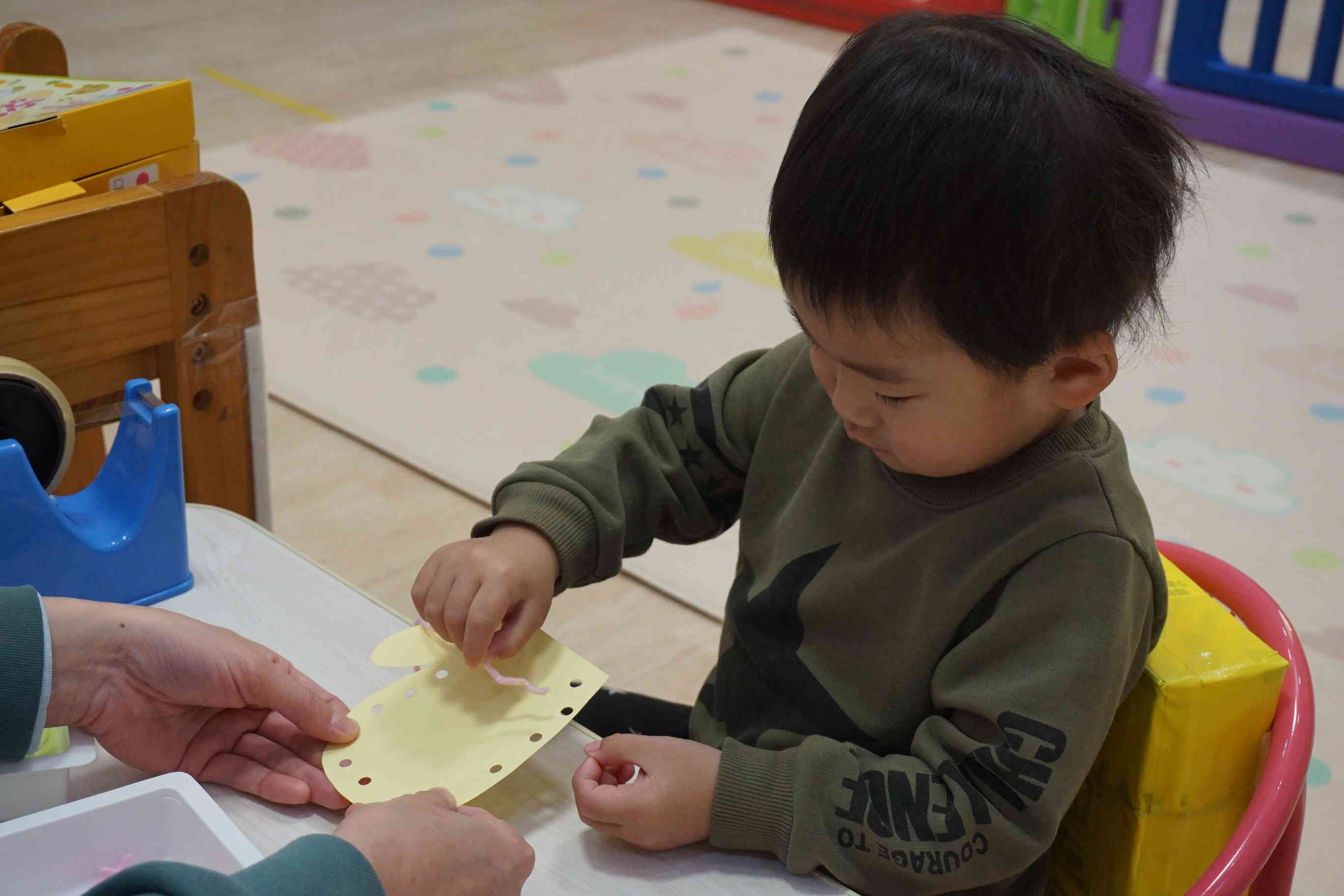 小さな穴に毛糸を通して・・・全集中の1歳児さん♪