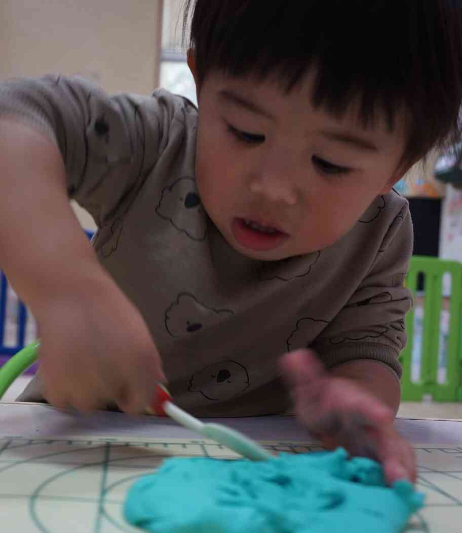 へらを使って大胆に切り刻んで、保育者にもいろいろ伝えながら創作しています