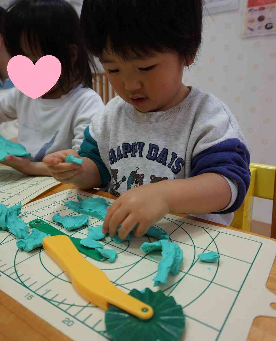 粘土をちぎったり丸めたりお友だちと何やらおしゃべりしながら?!楽しんでいます(^^♪