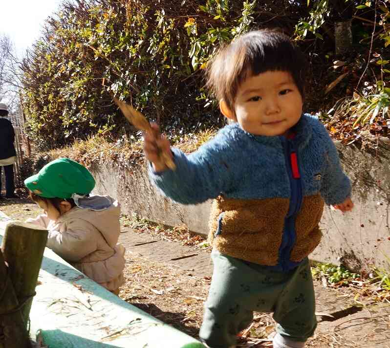 枯れ葉を集めて上にあげると舞い散る葉っぱにはしゃぐ子どもたち