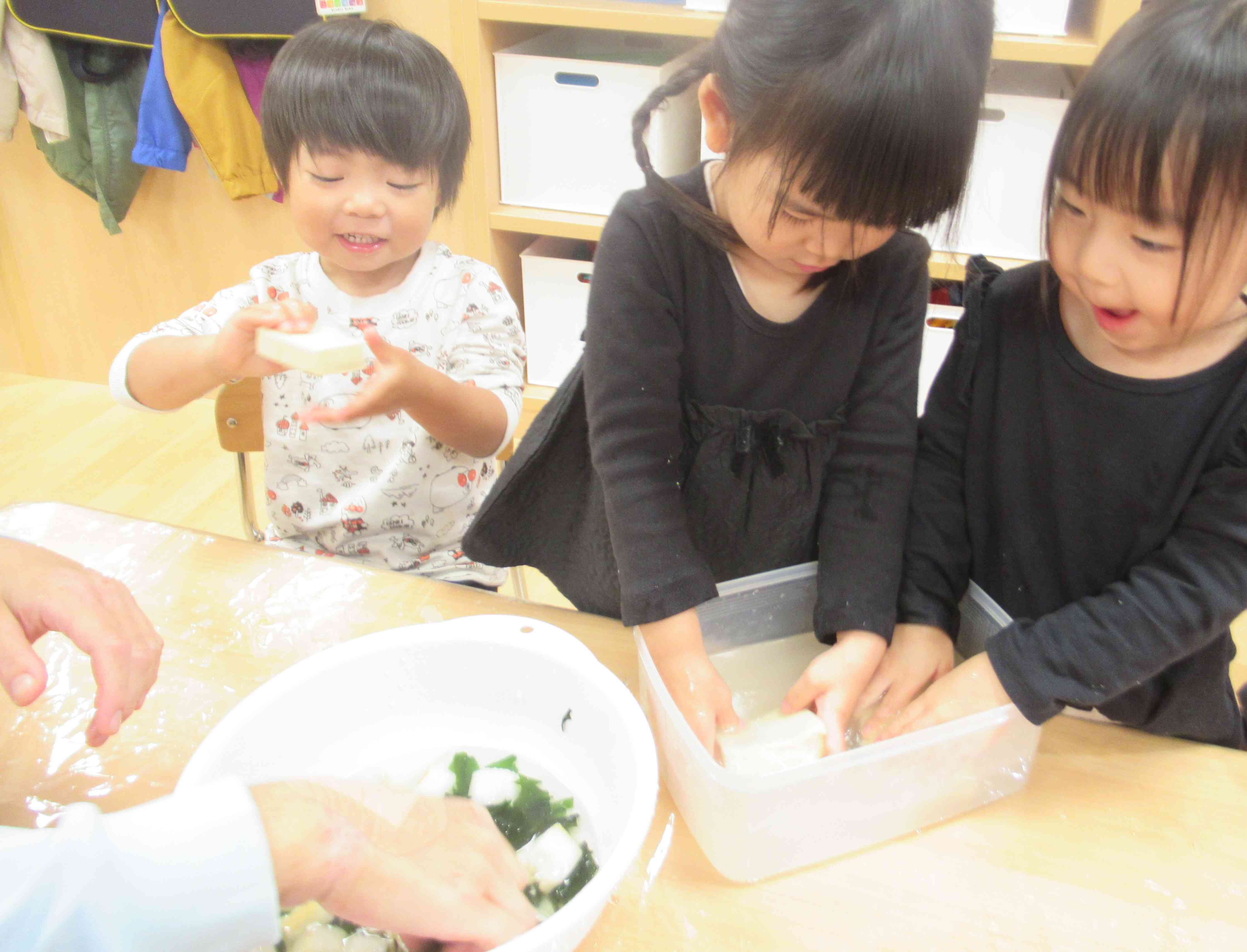 麩、高野豆腐、わかめ、切干大根も水の中に入れ、段々と柔らかくなると夢中になって触っていました!高野豆腐を絞って水が出てくることが面白かったみたいで、何度も絞っていました。