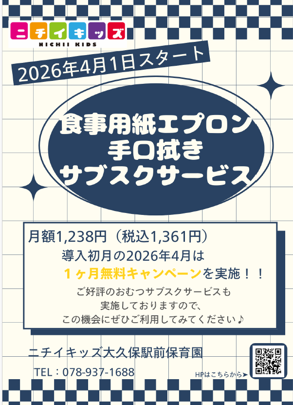 当園では、現在、おむつの定額使い放題サービス「Kaoすまいる登園」を導入しておりますが、2026年4月1日より、さらに、食事エプロンおよび手口拭きのサブスクサービスも導入いたします。