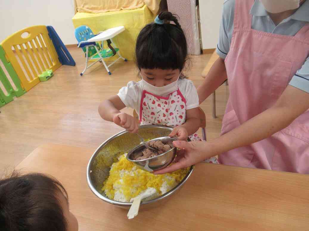 最後にゴマ油を!!ラップで丸めて、できあがりです♪ みんなでいただきまーす!!