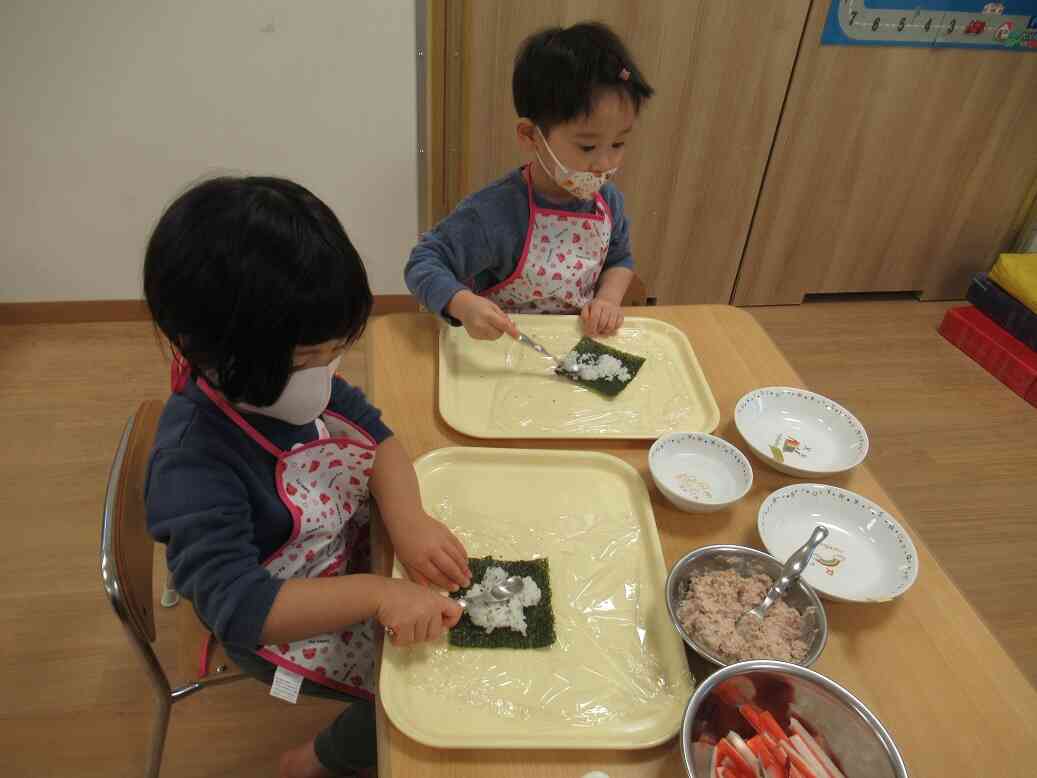 今日はうさぎ組さんが巻き寿司作りにチャレンジしま~す!!
