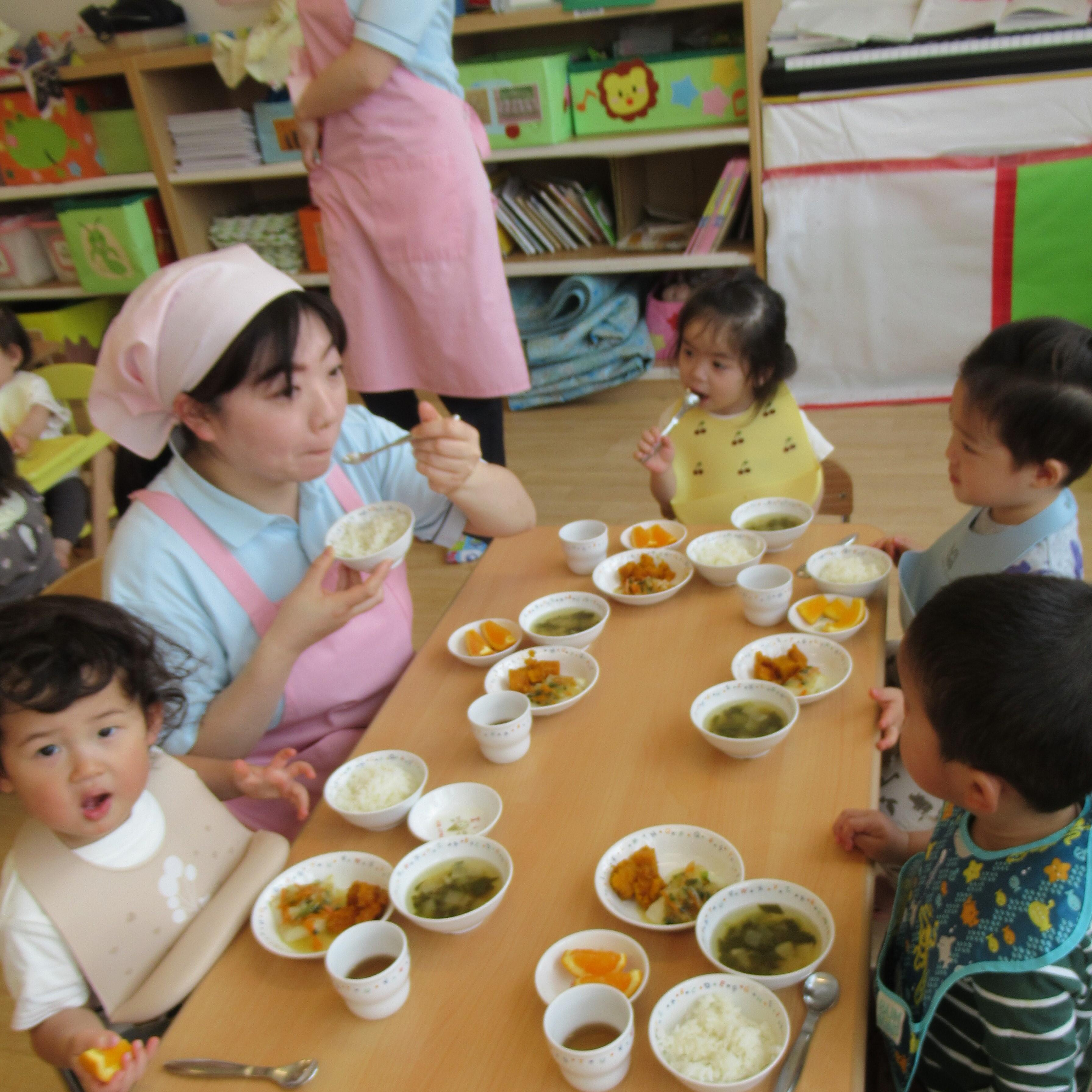 菜飯・きのこのおみそ汁・さばの竜田揚げ・はくさいの甘酢和え・バナナ ひよこ組のきのこさきの食育に合わせて、旬のきのこを使った「きのこのおみそ汁」を提供しました。 きのこから出る旨味が子どもたちの食欲をそそり、みそ汁も完食でした♡
