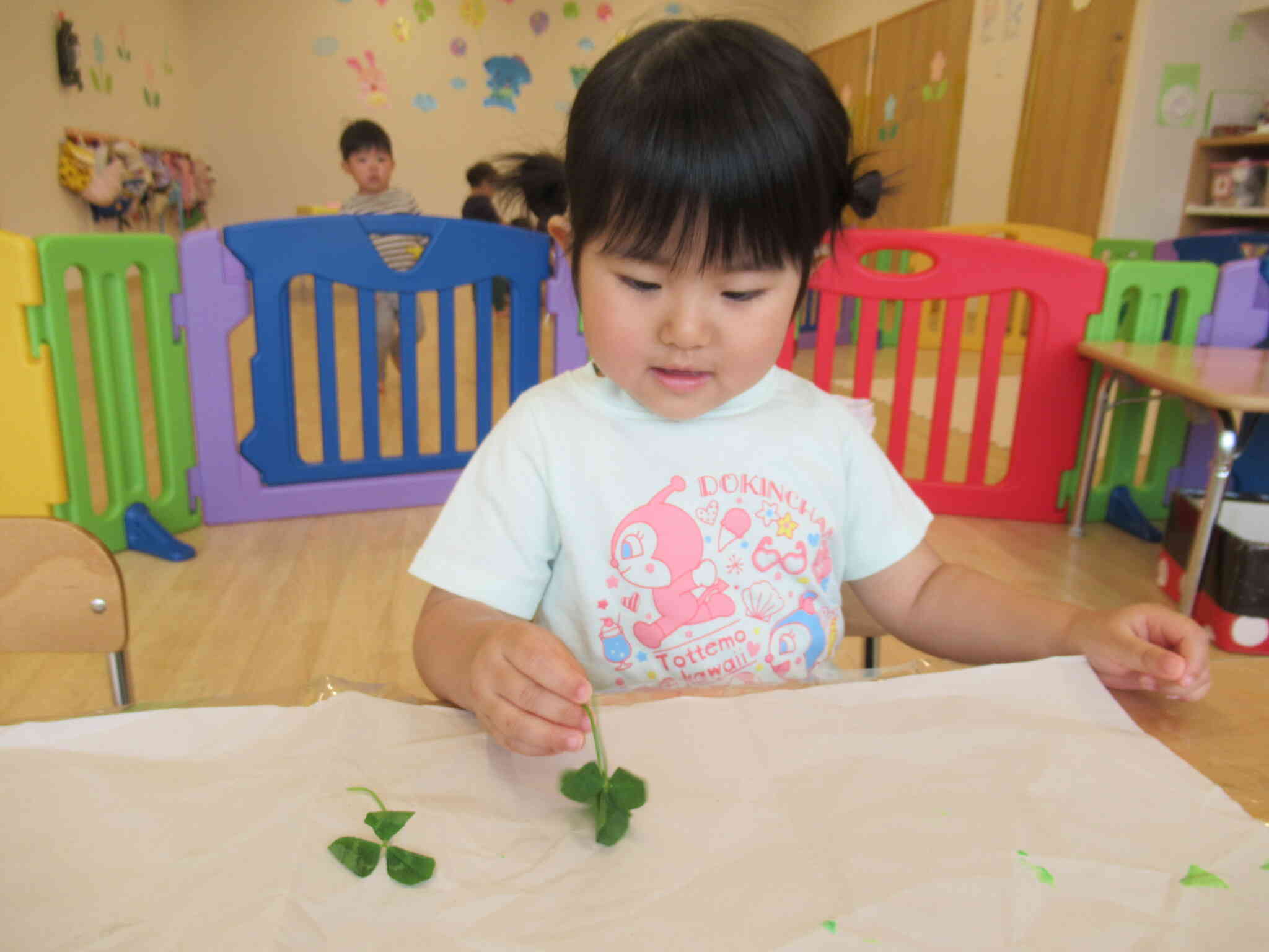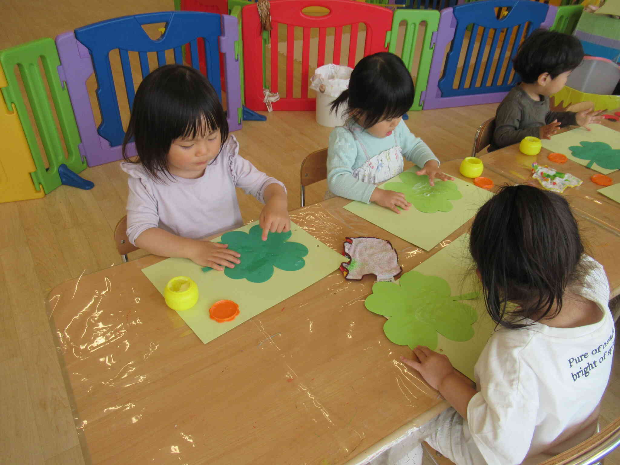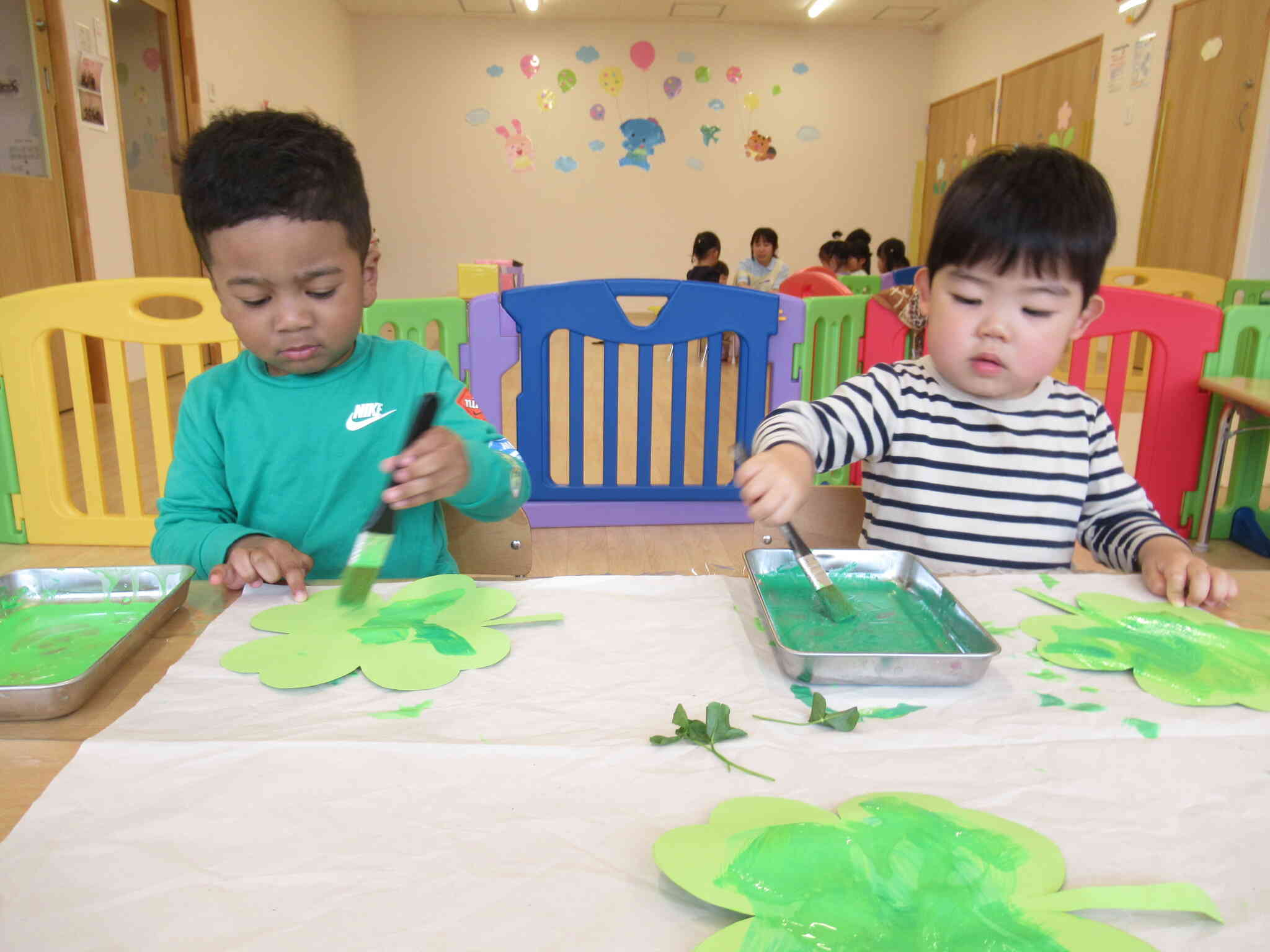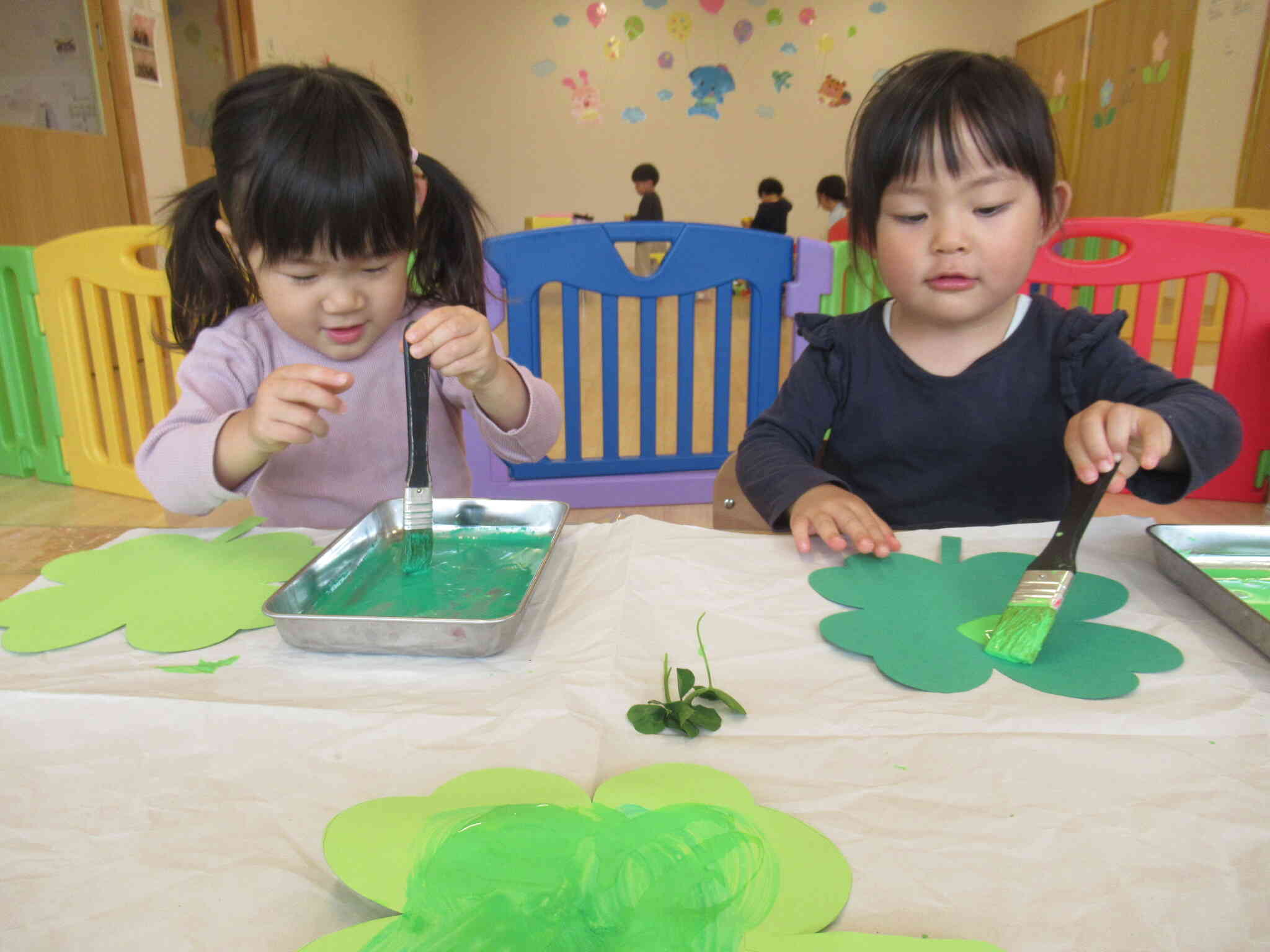緑と黄緑の絵の具を自由に選んでクローバーの形の画用紙に色付けをしました。