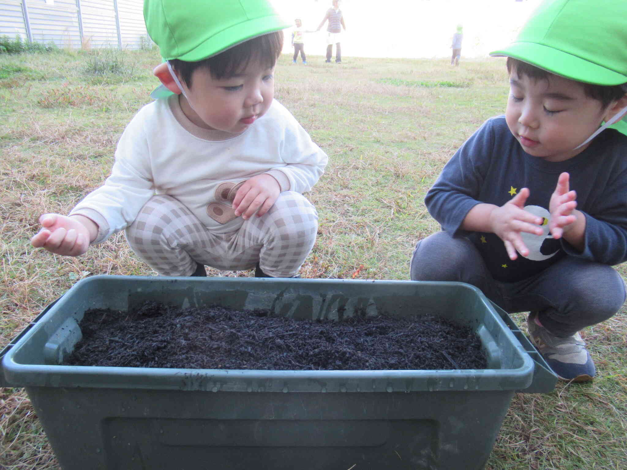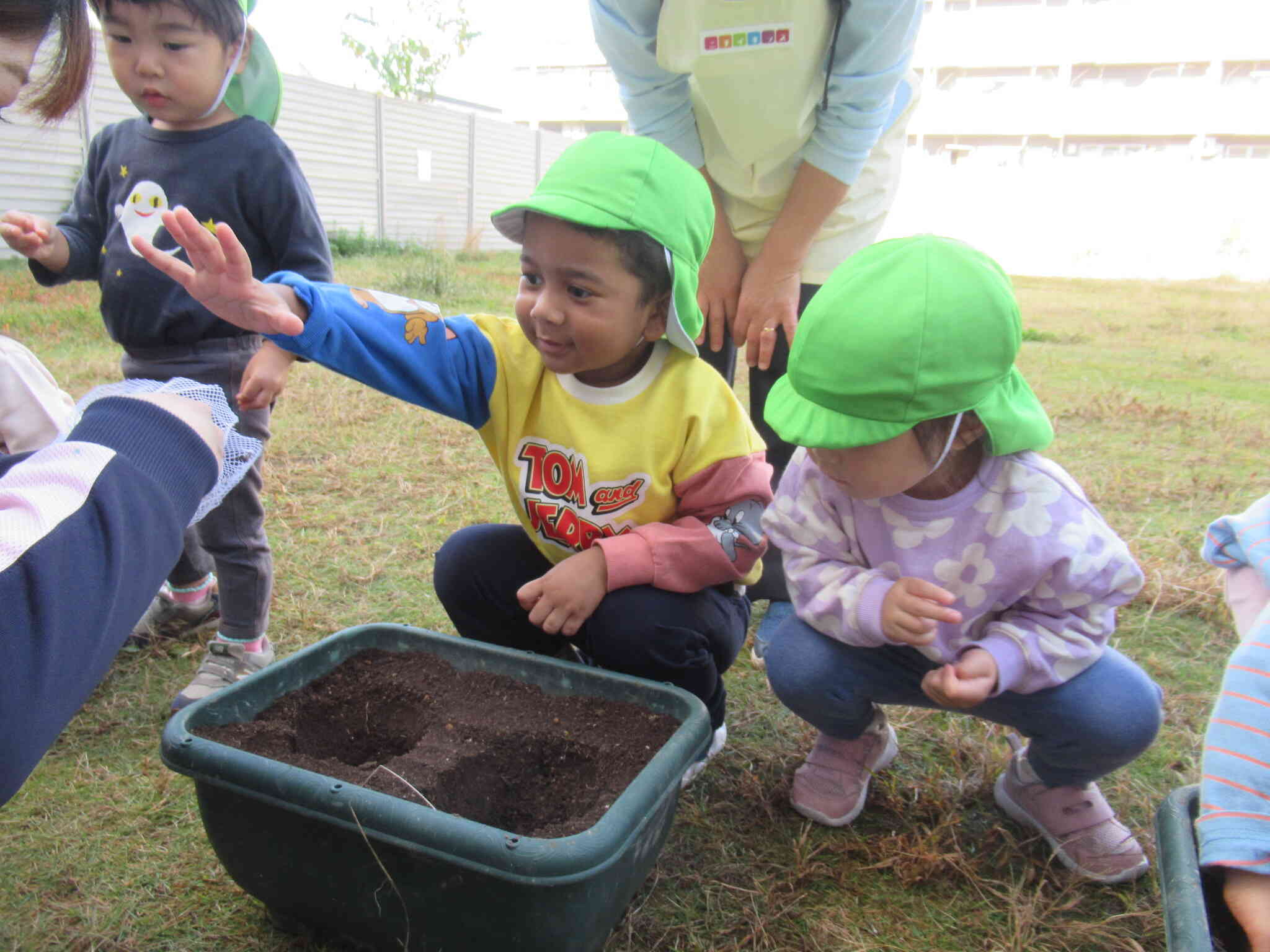 チューリップを植えた後は、みんなで手を繋いで大きなたいこをしたよ~!