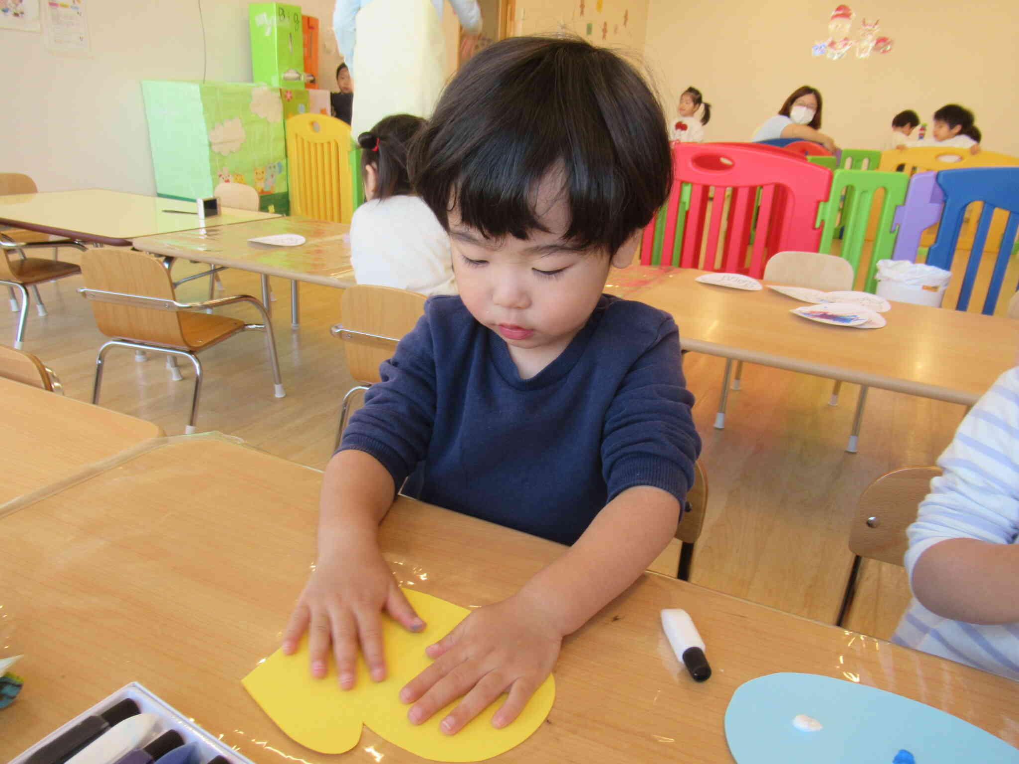 好きな色の絵の具を画用紙の片面につけ