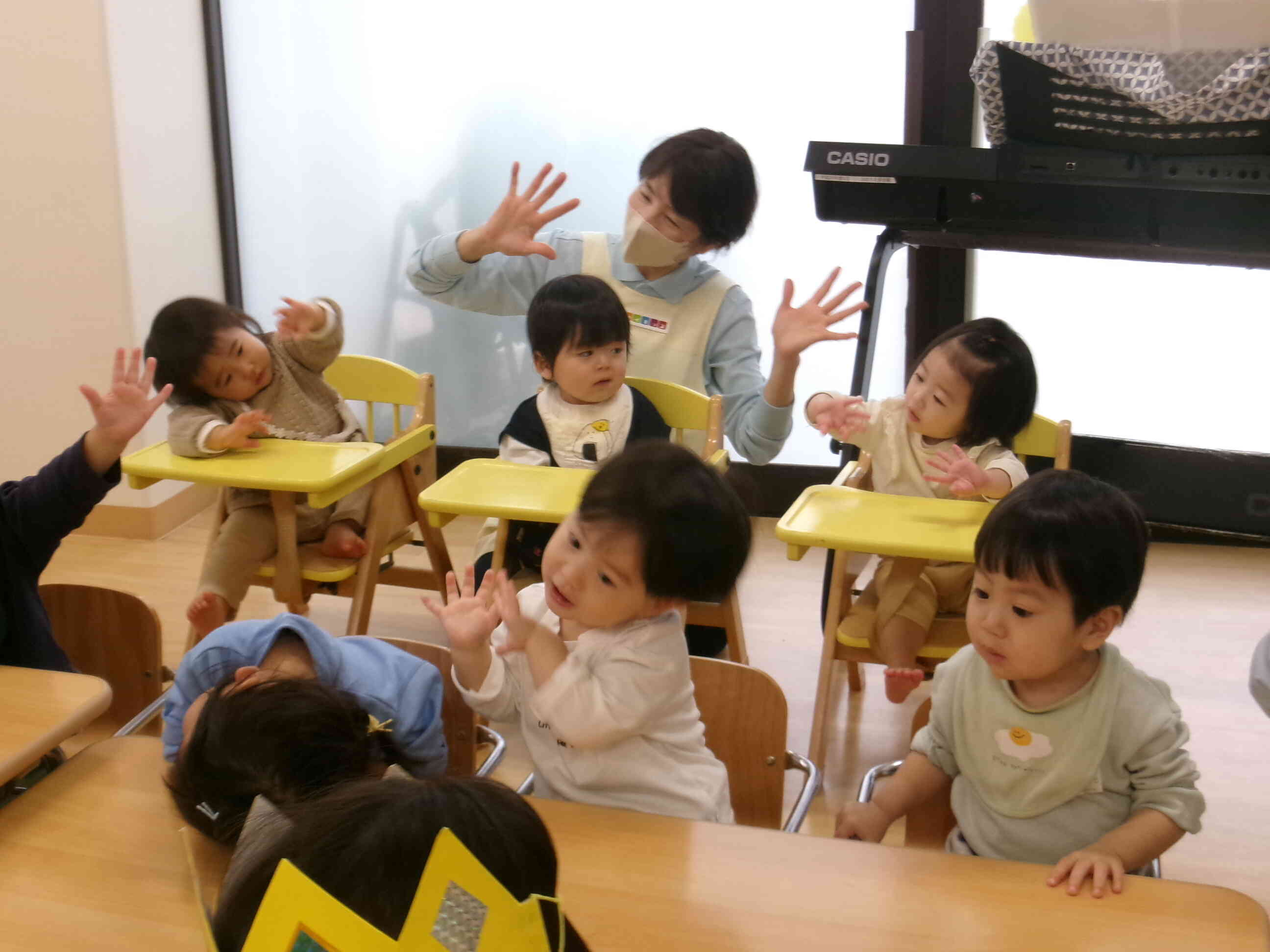 「グーチョキパー」ひなまつりバージョンの手遊びもばっちりと真似してくれたひよこぐみ(0歳児)です。
