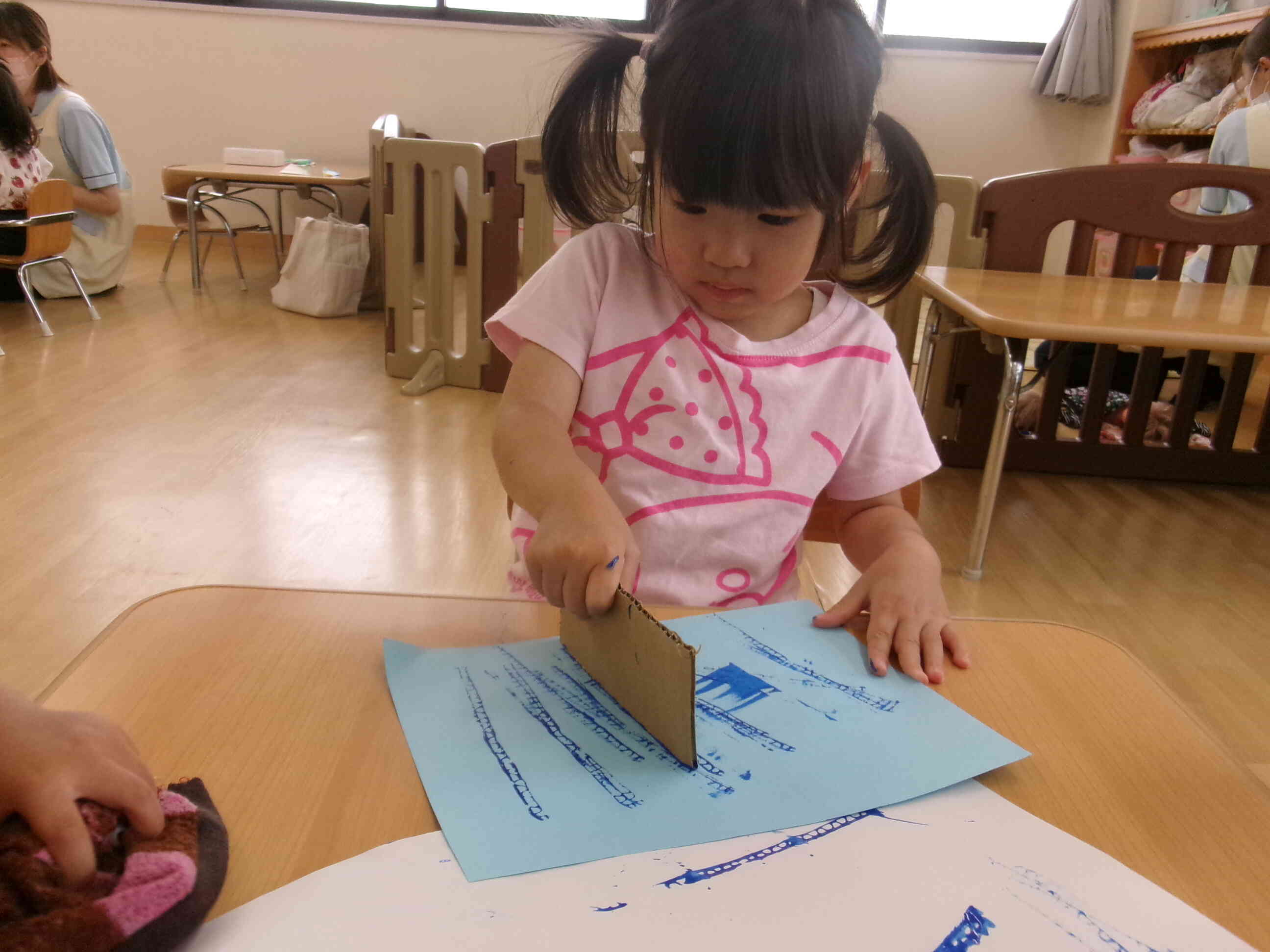 青い絵の具を段ボールにつけてぺったんすると・・・