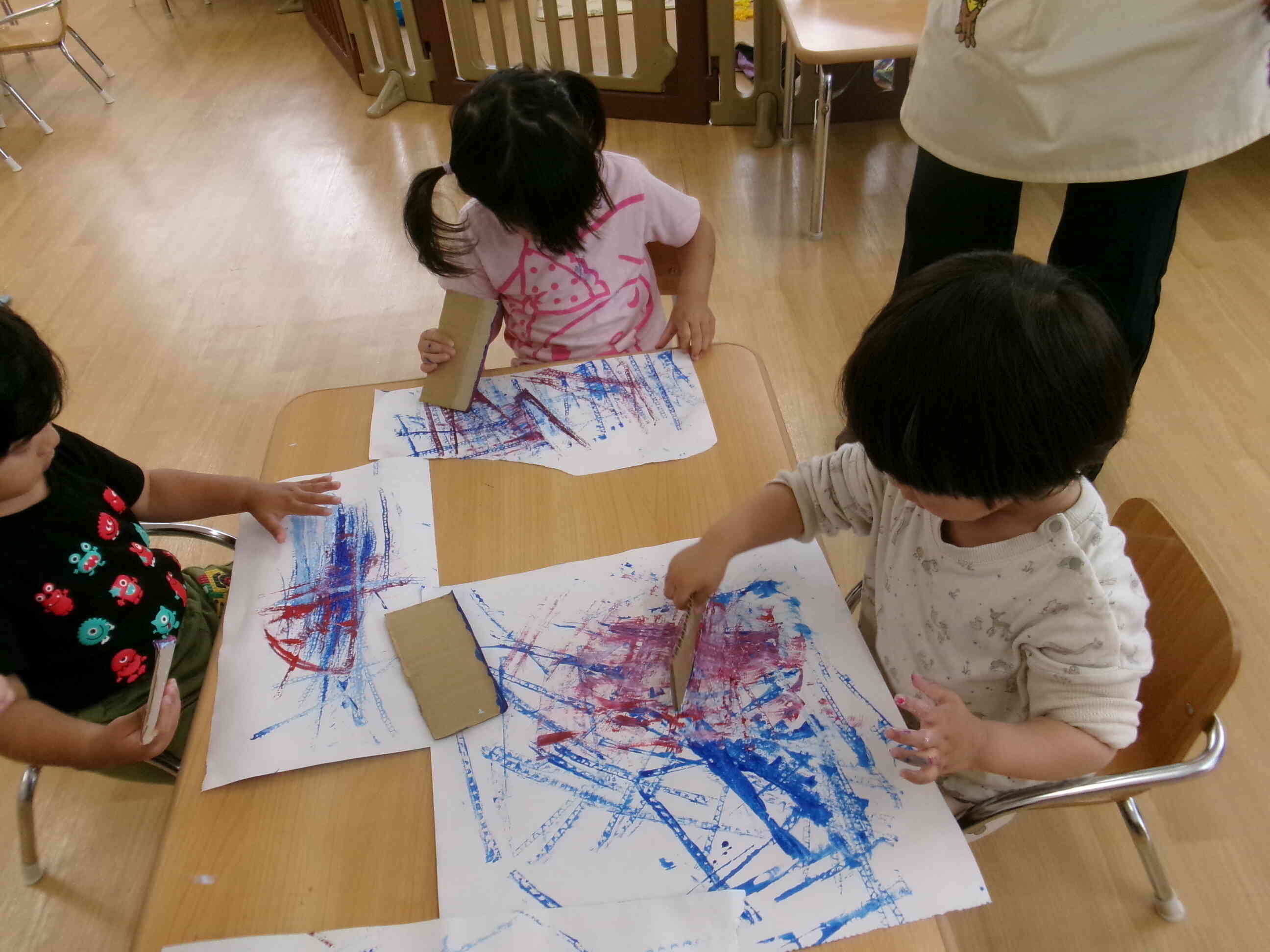 それぞれの画用紙にスタンプした後は「もっとしたいーー!」とリクエストがあり、広い紙にもたくさんスタンプしました。