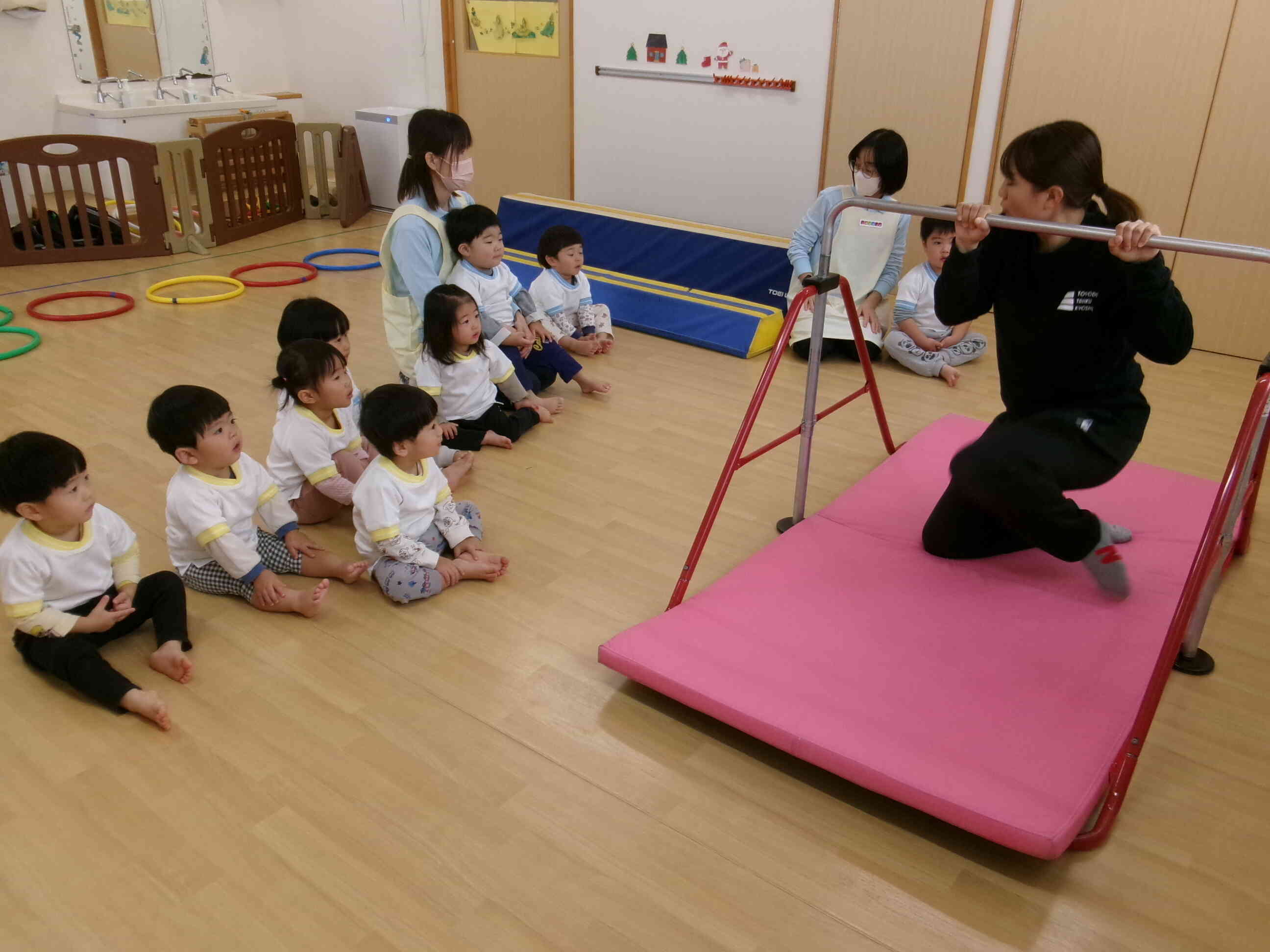 出来そうなお友だちは、足をくぐらせ1回転。先生に手伝ってもらいながら真剣にチャレンジしていました。