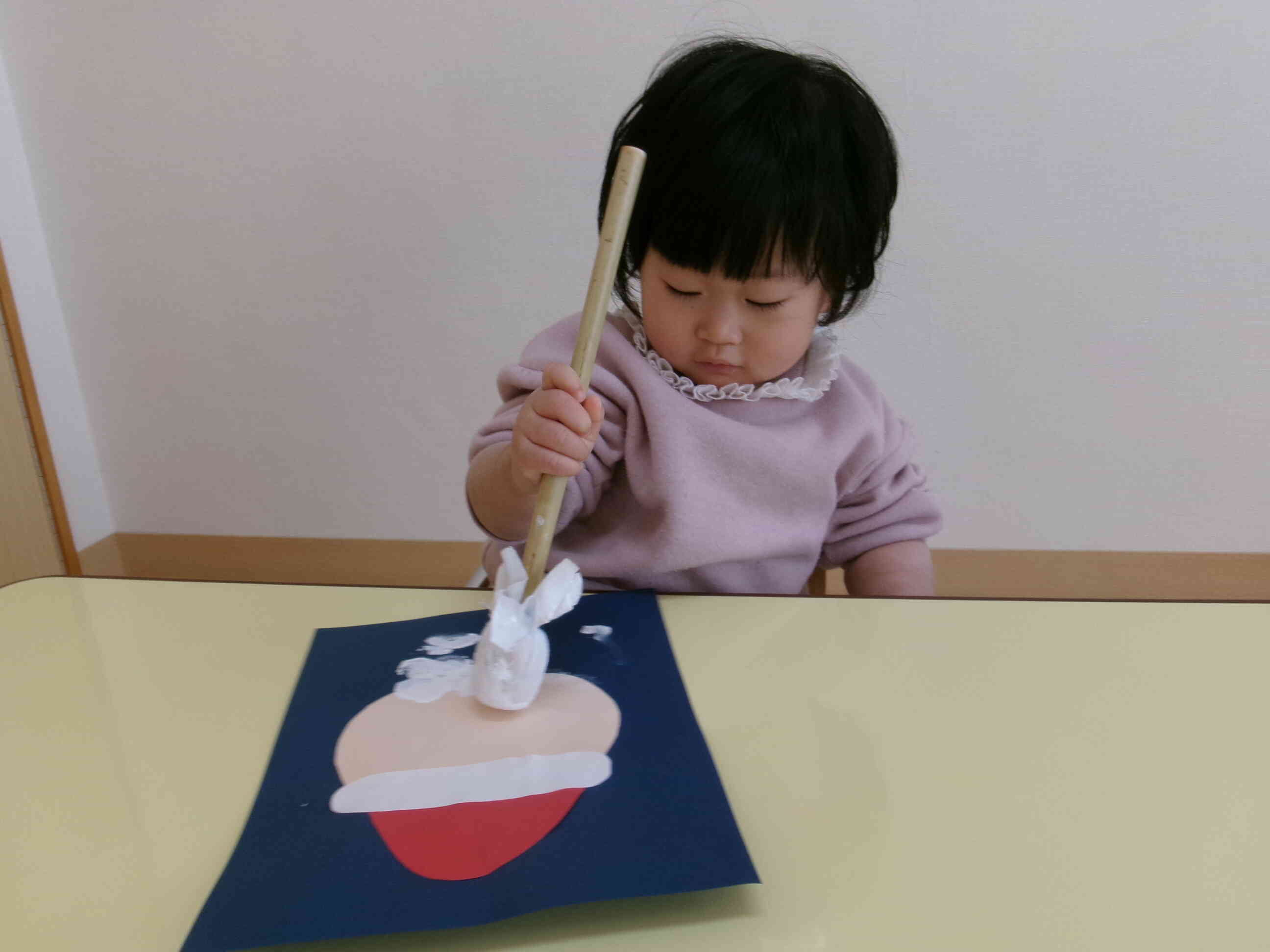 タンポスタンプを使ってサンタさんのおひげを付けました!