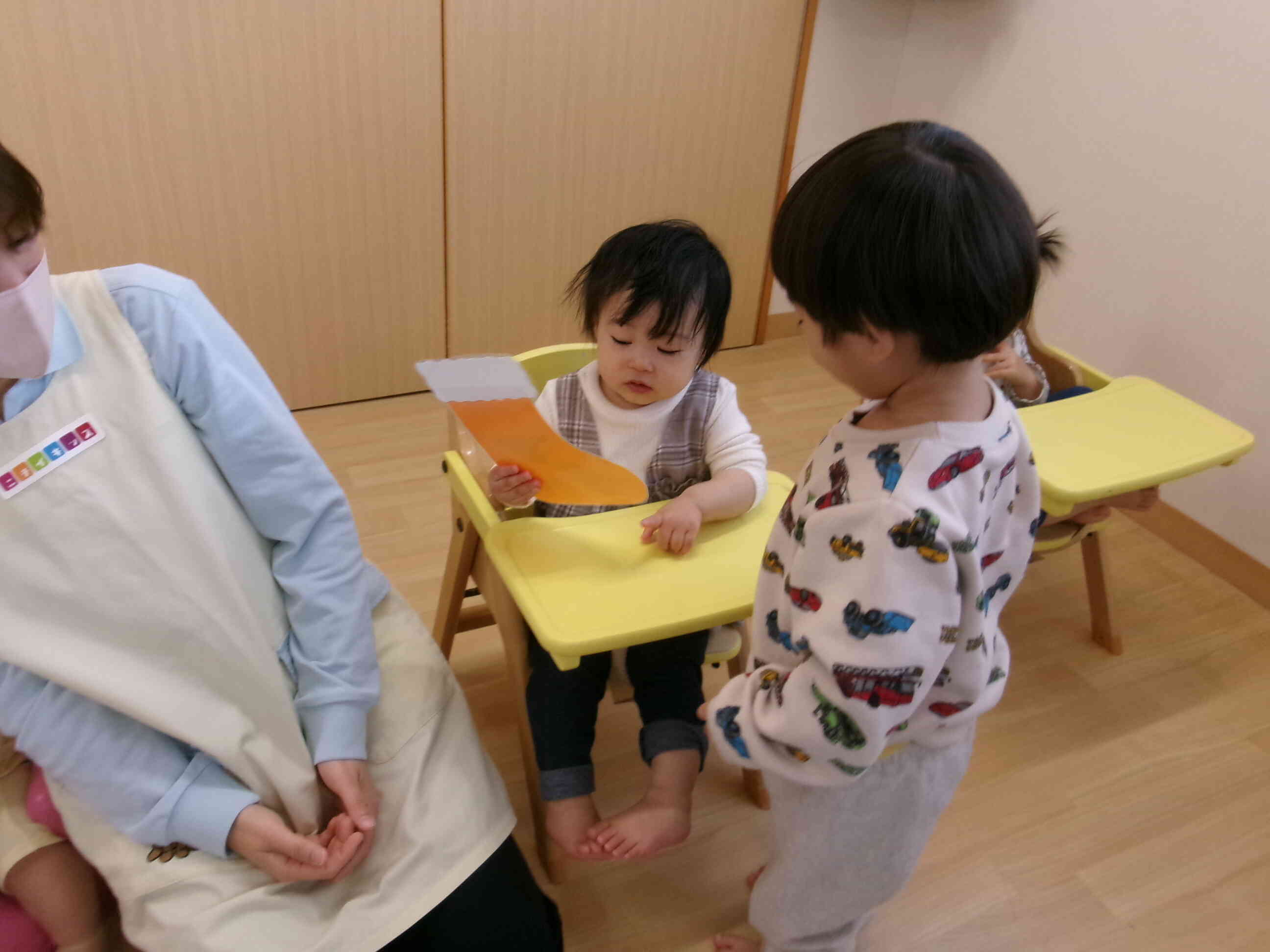 ひよこぐみのお友だちに「はい、どうぞ!」、2人とも笑顔になり可愛かったです。