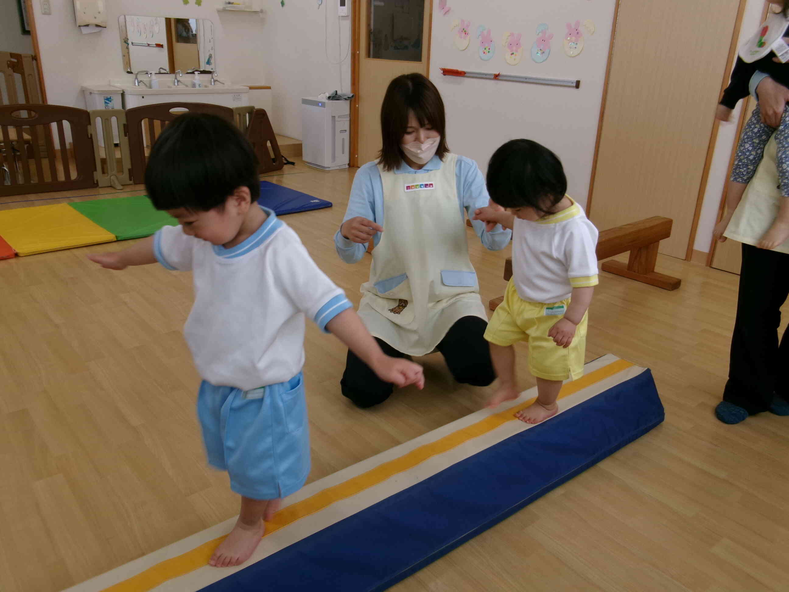 1歳児のお友だちも保育者に見守られながら初めての平均台を歩きました。