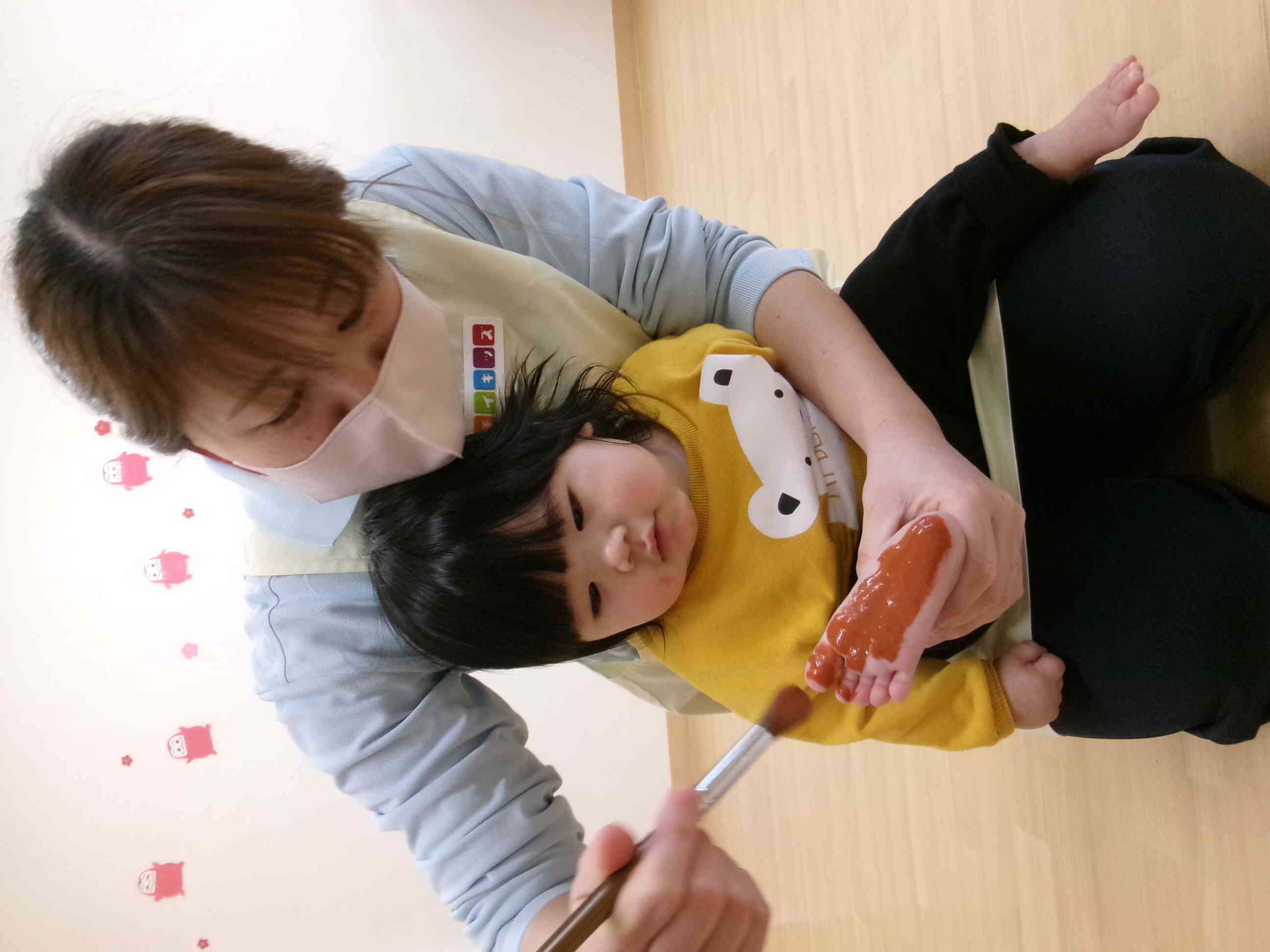 こちらのお友だちは、足の裏に絵の具を塗ると、少しくすぐったそうな表情を浮かべていましたよ。