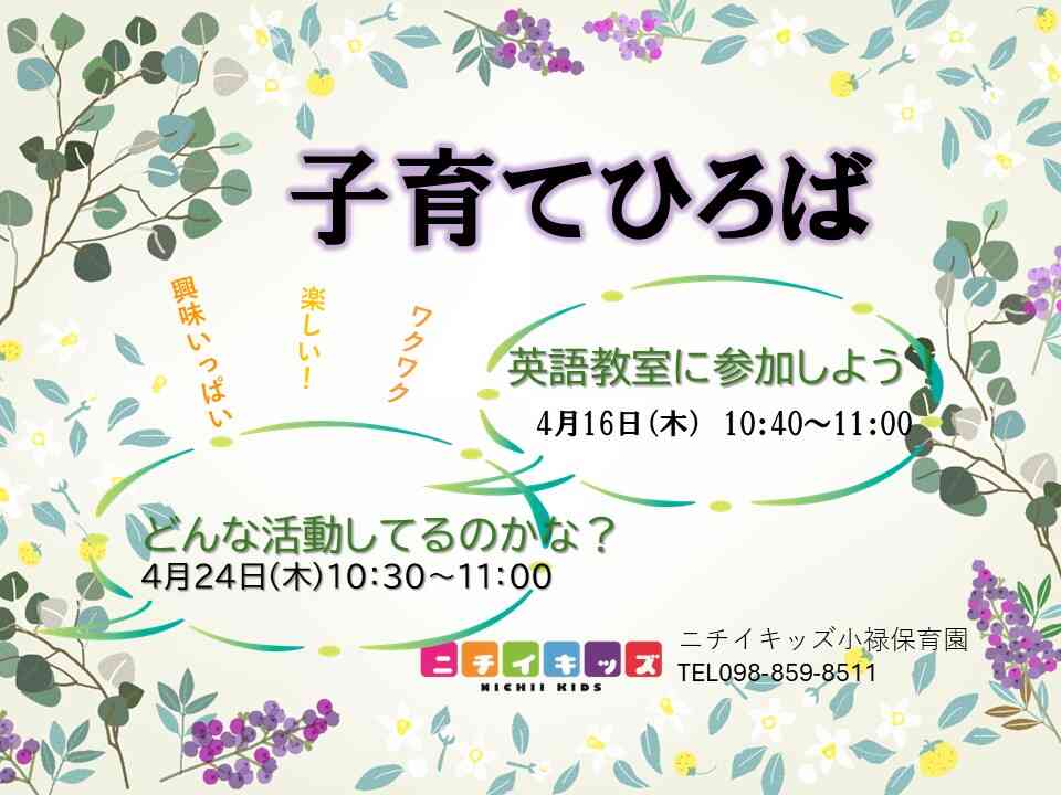 4月の子育てひろば 英語レッスン体験・保育活動の様子を除いてみませんか?