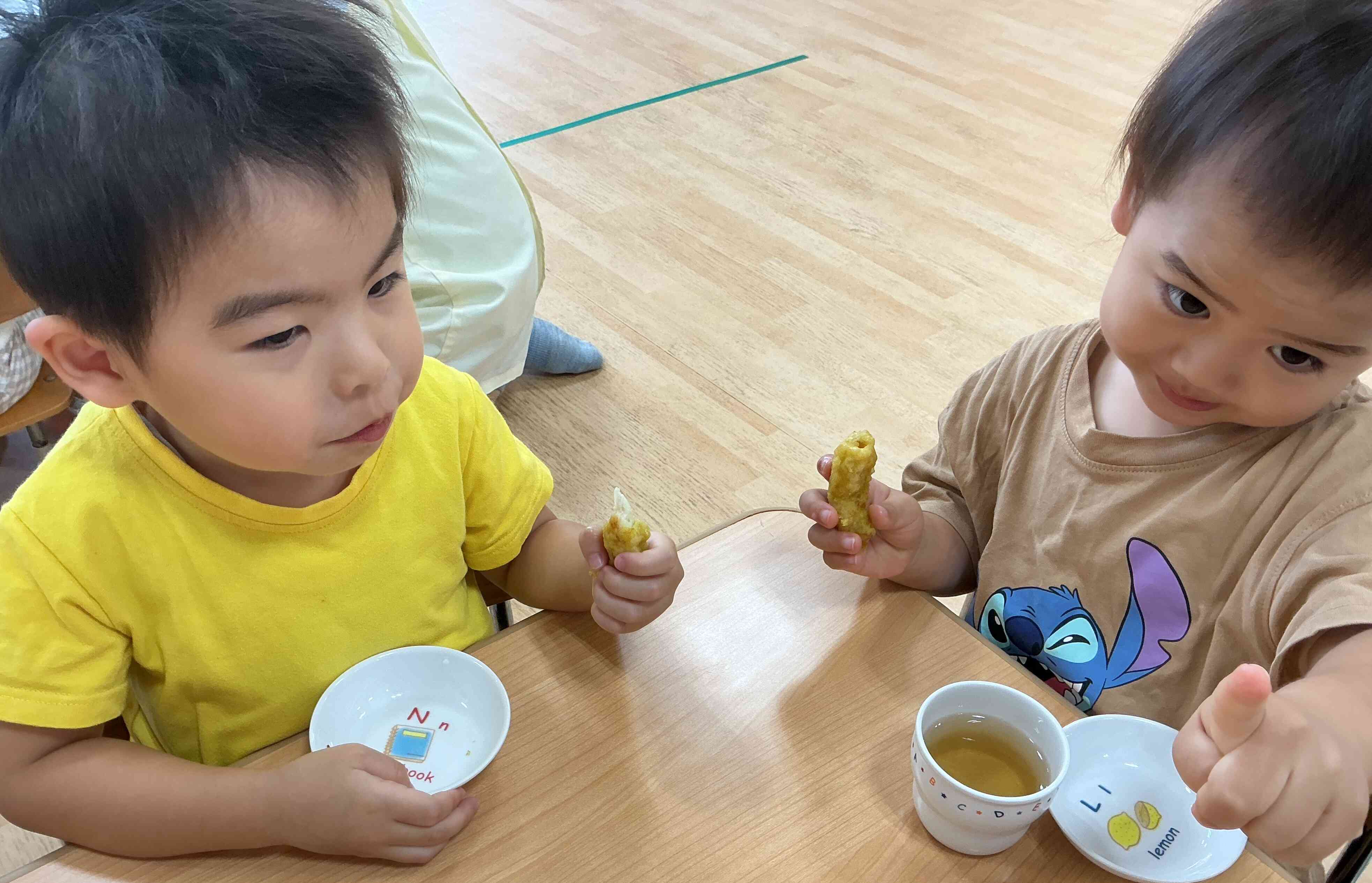 沖縄の天ぷらは、地元では「おやつ」や「軽食」として非常に親しまれています。園のおやつにも取り入れており今日はカレー味魚の天ぷらでした!子どもが片手で持ちやすく、おやつに喜ばれるメニューです。自然と笑みがこぼれお友だち同士ニコニコ笑いながら「おいしいね!」という声も聞こえ、スティック状で持ちやすく美味しい嬉しい~と鼻歌を歌いだす子もいました。とっても楽しいおやつタイムになりました。