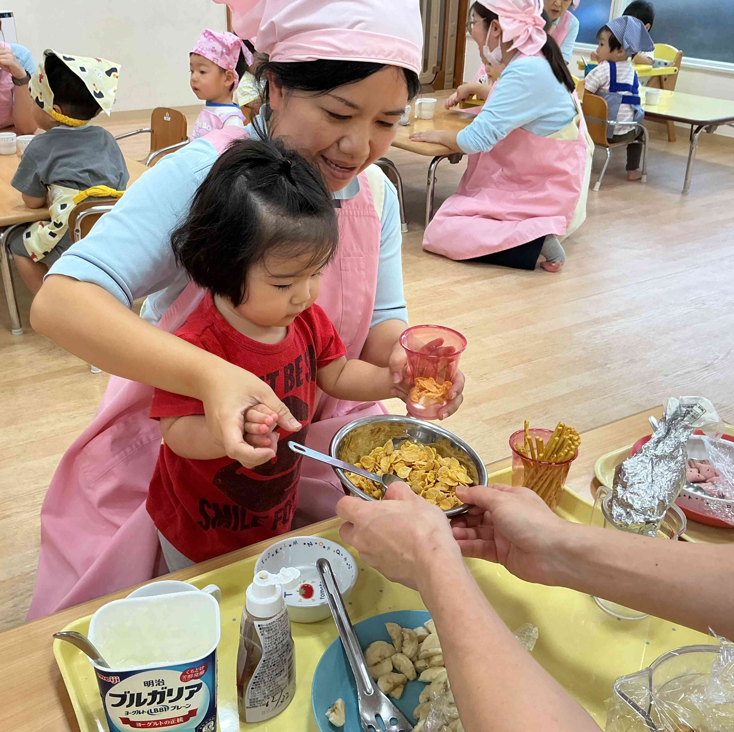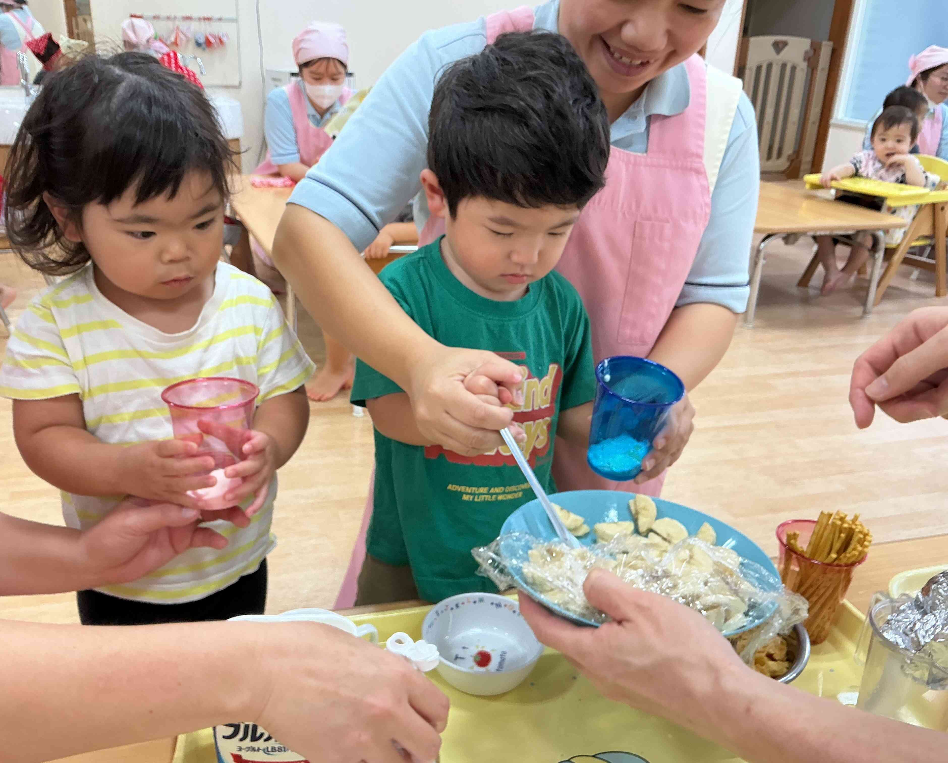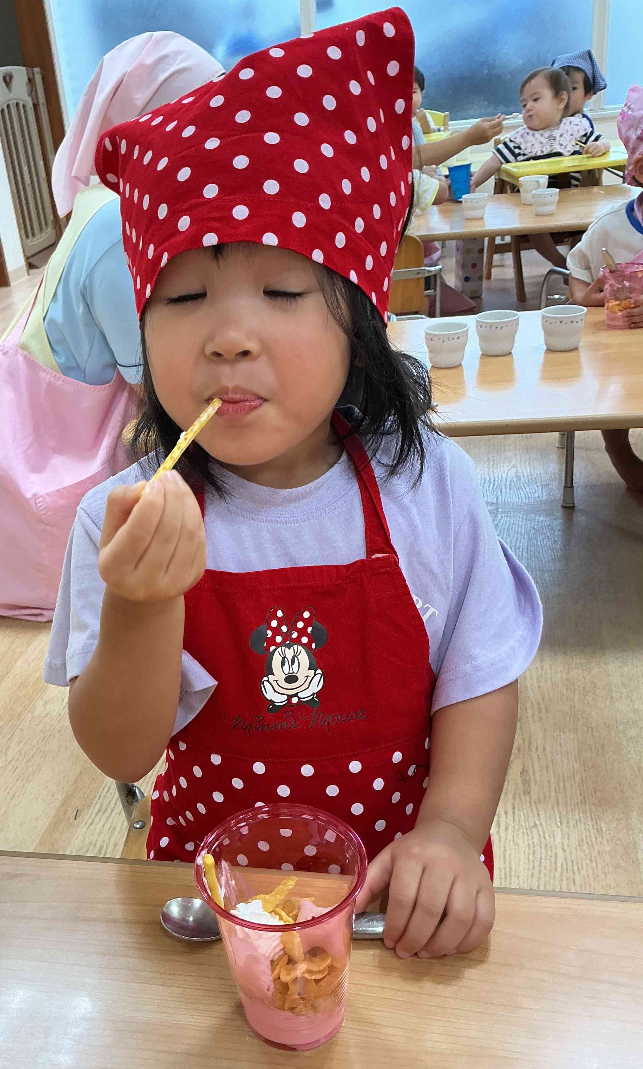今日はクリスマス食育としてパフェづくりに挑戦しました!カップの中にヨーグルト・コーンフレーク・バナナ、プリッツ、『どれにしようかな?』と真剣に選びながら盛り付けて、仕上げにクリームをちょんと乗せると、自分だけのパフェに満面の笑みを浮かべていました。自分で作ったパフェの味は格別だったようで、あっという間に完食です!