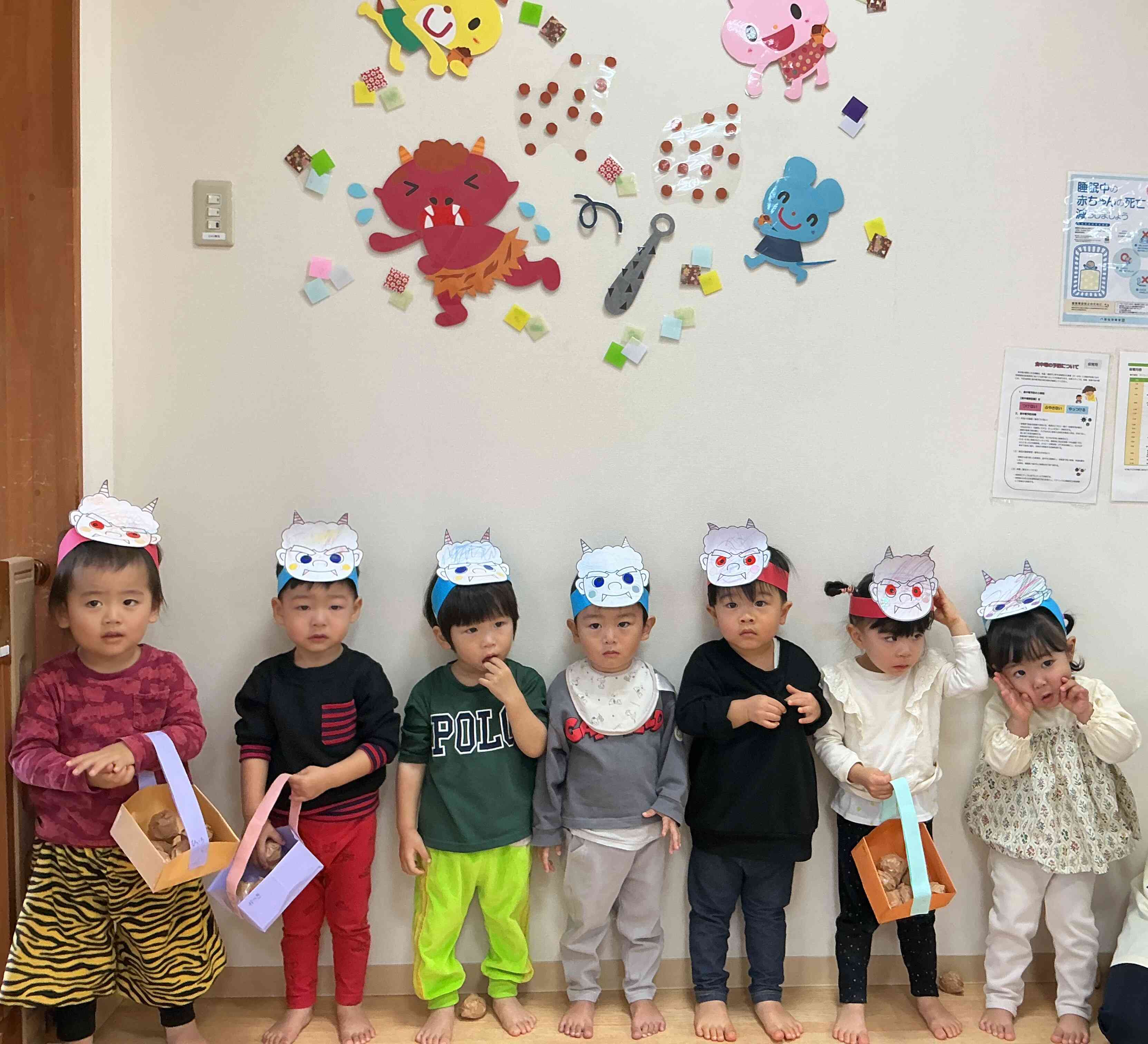 今日は節分の豆まきを行いました。鬼が登場すると、最初は驚いて先生の後ろに隠れる姿も見られましたが、最後には『おにはそと!』と元気な声で新聞紙の豆を投げることができました。
