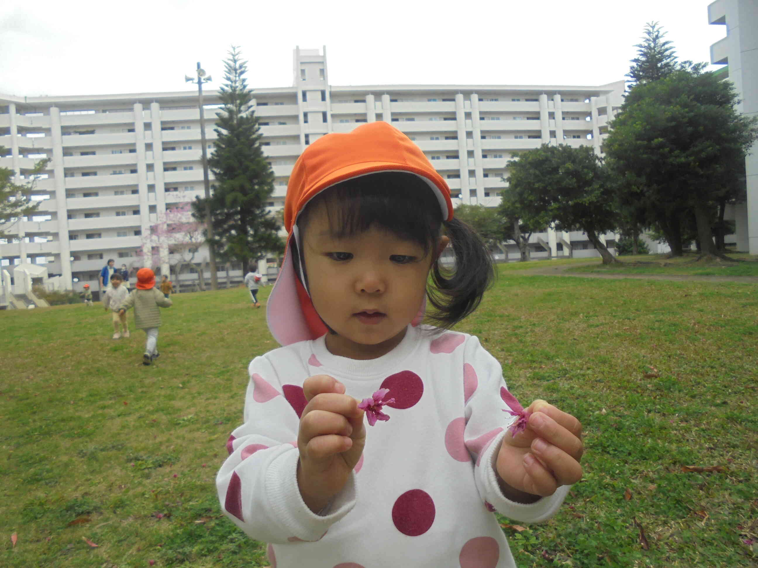 外遊びでみつけた草木を、先生みてみて~ お友達に見てみて~とお互いに大興奮して見せ合い、一人が見つけると次々に探しに走り出したり、これは何かな?と首をかしげたり。たのしい外遊びの時間でした。
