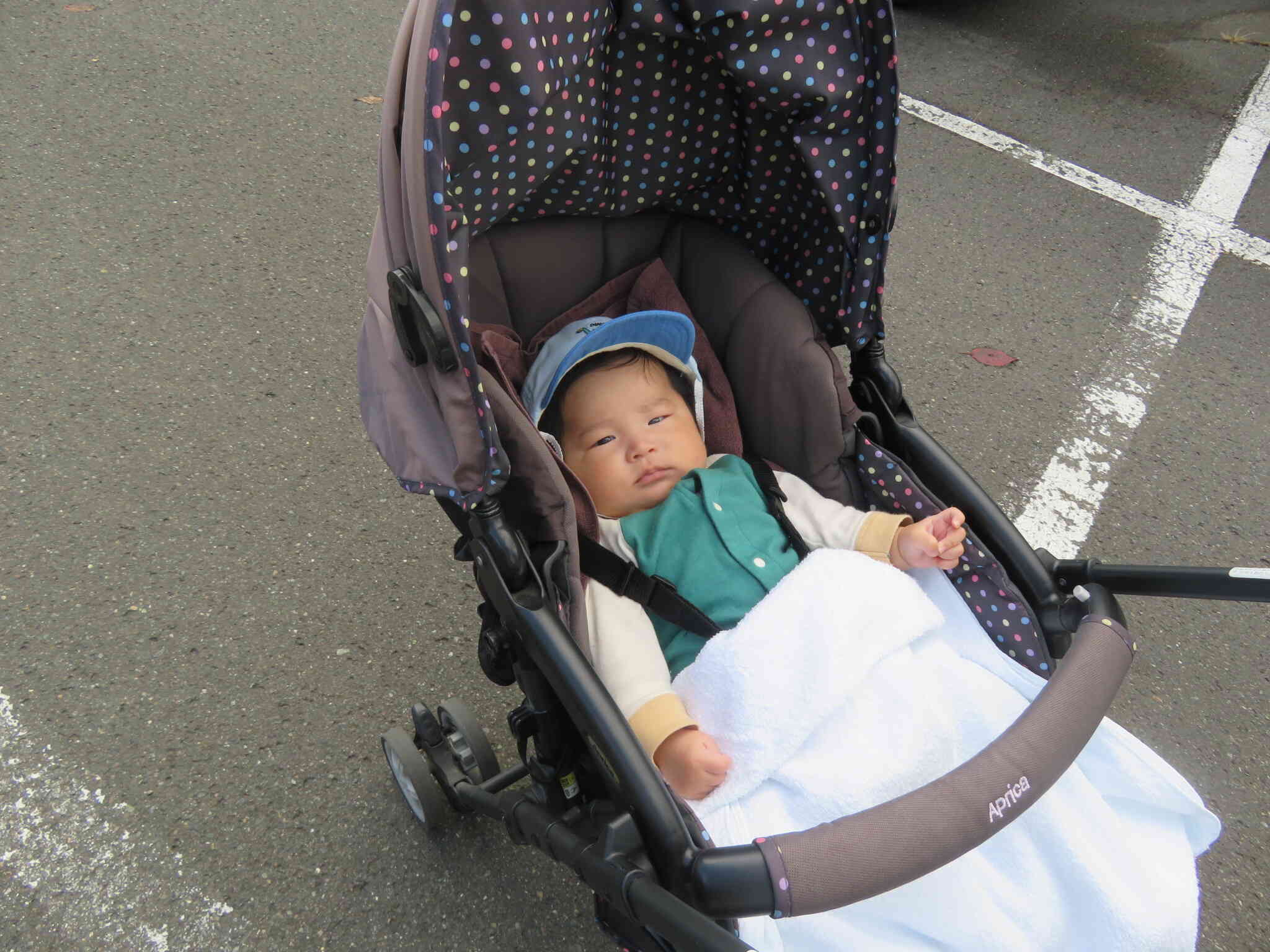 暖かい秋の日差しの中、ベビーカーでのんびりお散歩・・・ぼくの愛車乗り心地最高なんだよ♪