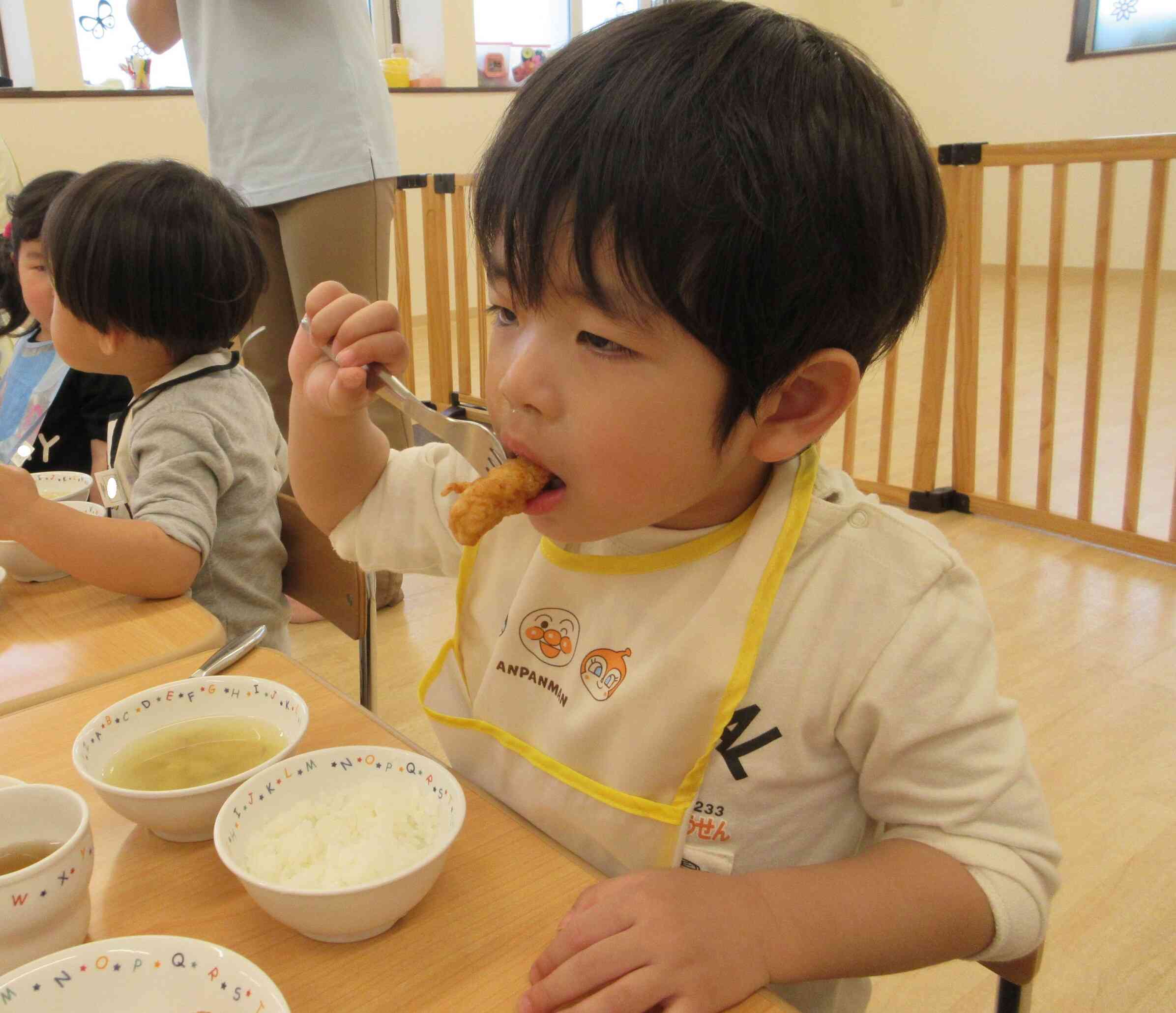 絵本を通して『よく噛んで食べる大切さ』について学びました。子ども達は、絵本や保育者の口の動きをみて、「もぐもぐだね!」「カミカミするよ!」等、お口を動かしている子の姿もみられましたよ。『カミカミメニュー』に、子ども達の大好きな【から揚げ】がスティック状で提供されました。フォ―クを使って上手に噛みちぎって食べていました。