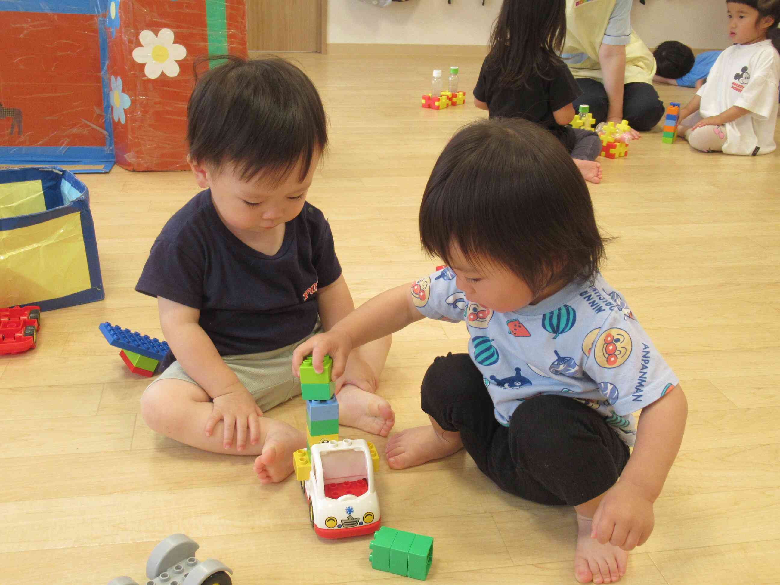 ブロックでの遊び方は発想力が素晴らしくて、「おぉ~!」と感心させられます。時にはお友だちとぶつかることもありますが、保育士が間に入って話をすると納得して気持ちを切り替え、また遊びだすことができます。