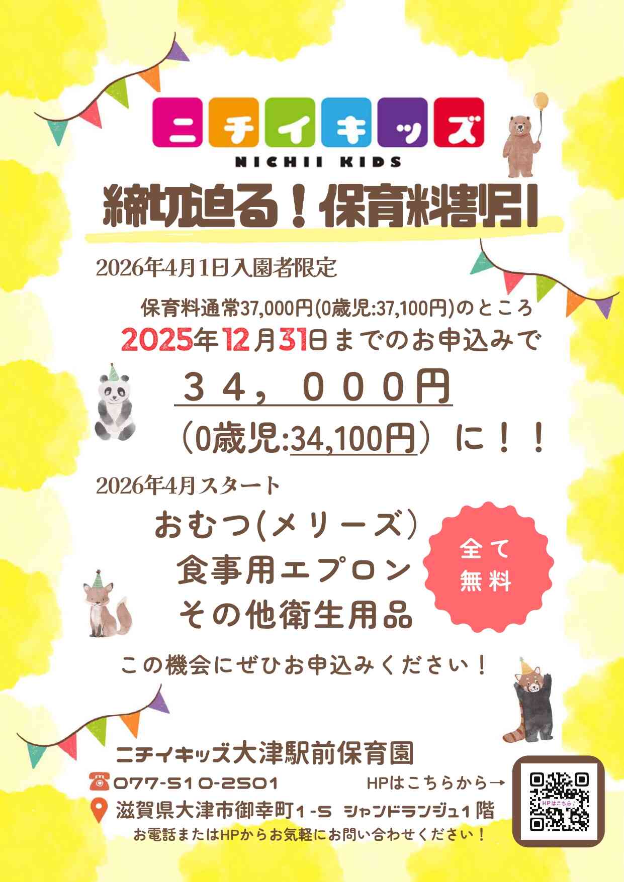 保育料の早期割引:2025年12月31日までに継続決定・専願(2026年4月1日入園)での申込の提出となります。