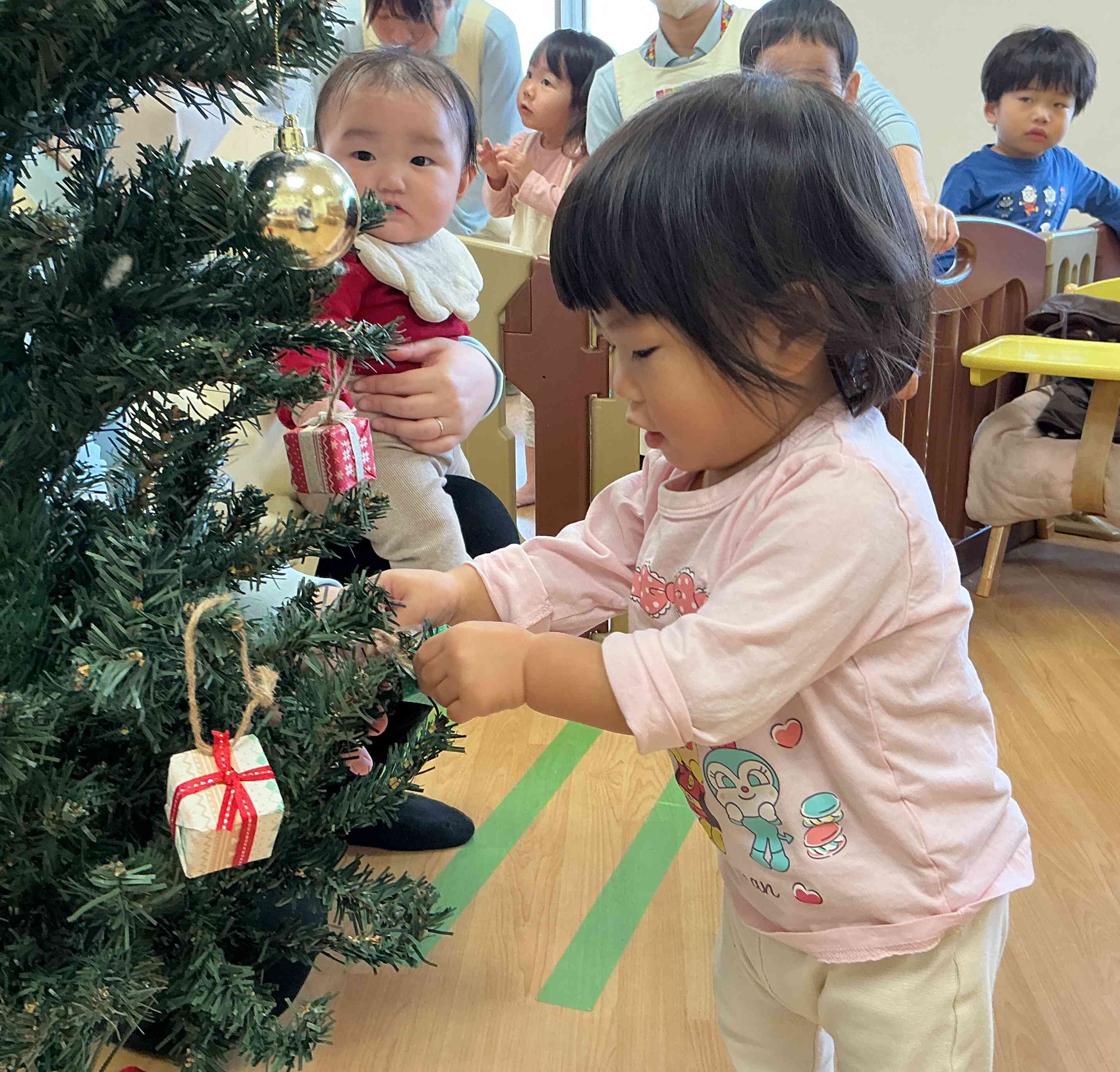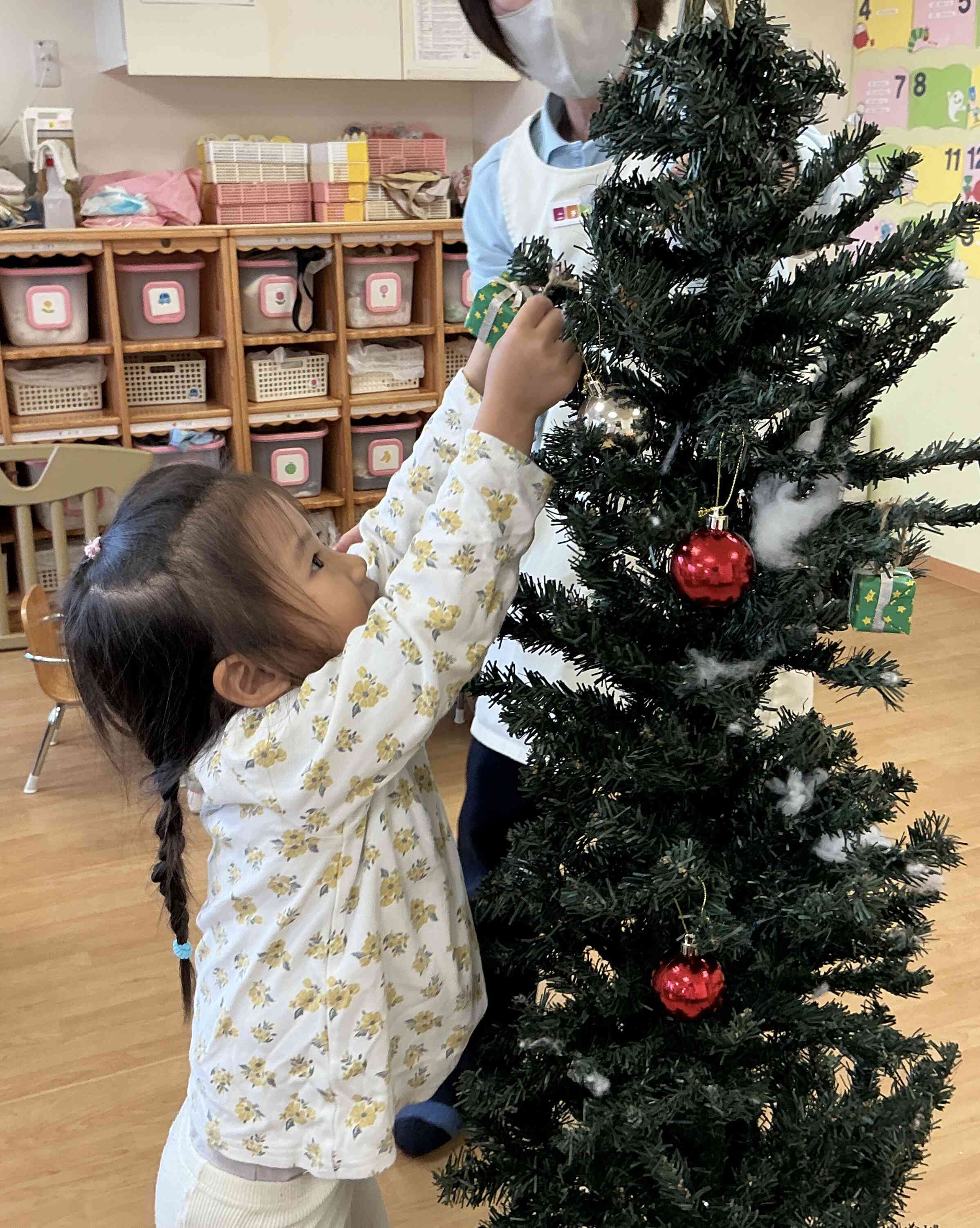 う~んと背伸びをしながら、ひよこ組さん・あひる組さんには届かないところにつけてくれました。
