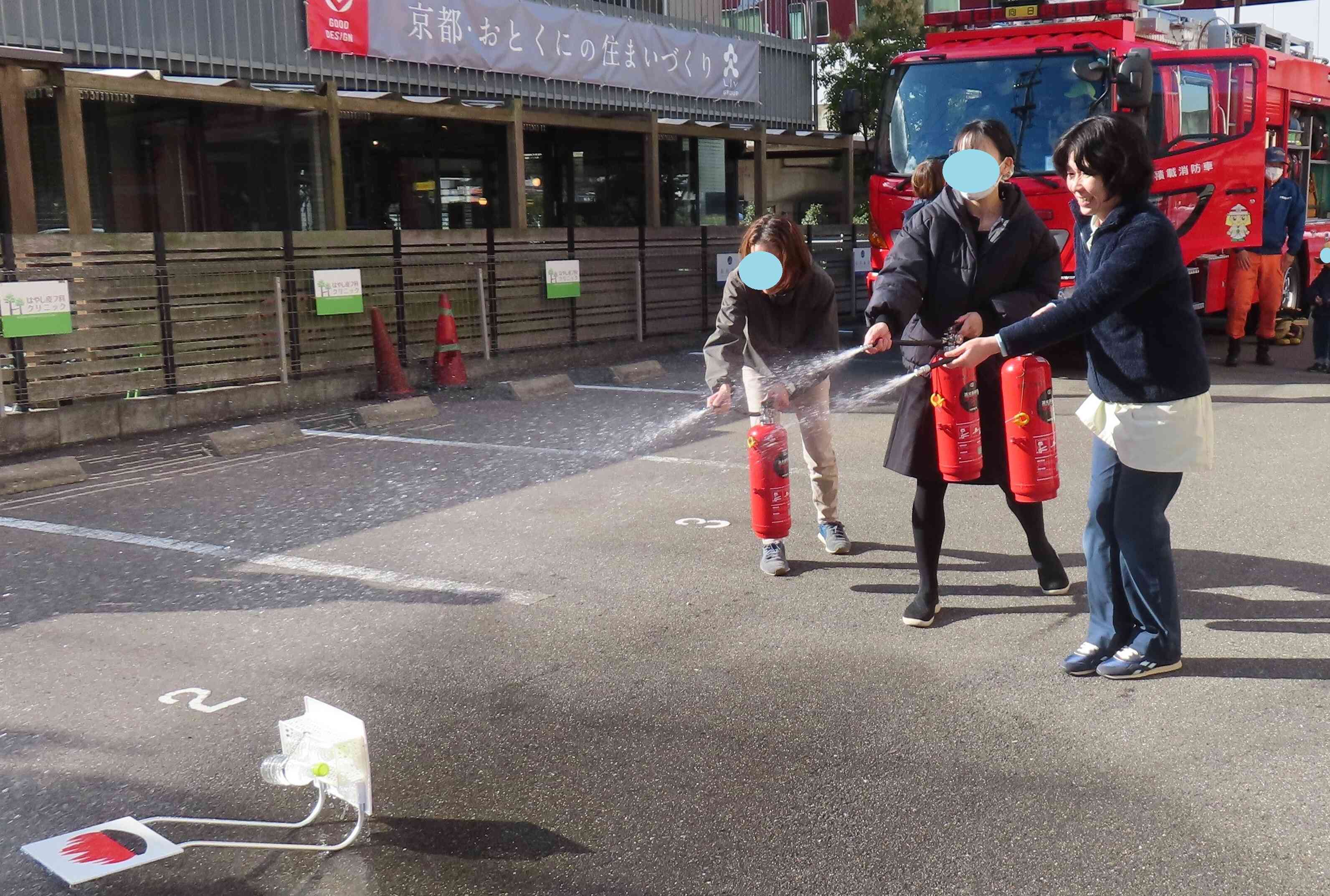 「がんばれ~」と声援を受けながら、先生たちは消火訓練に参加しました。