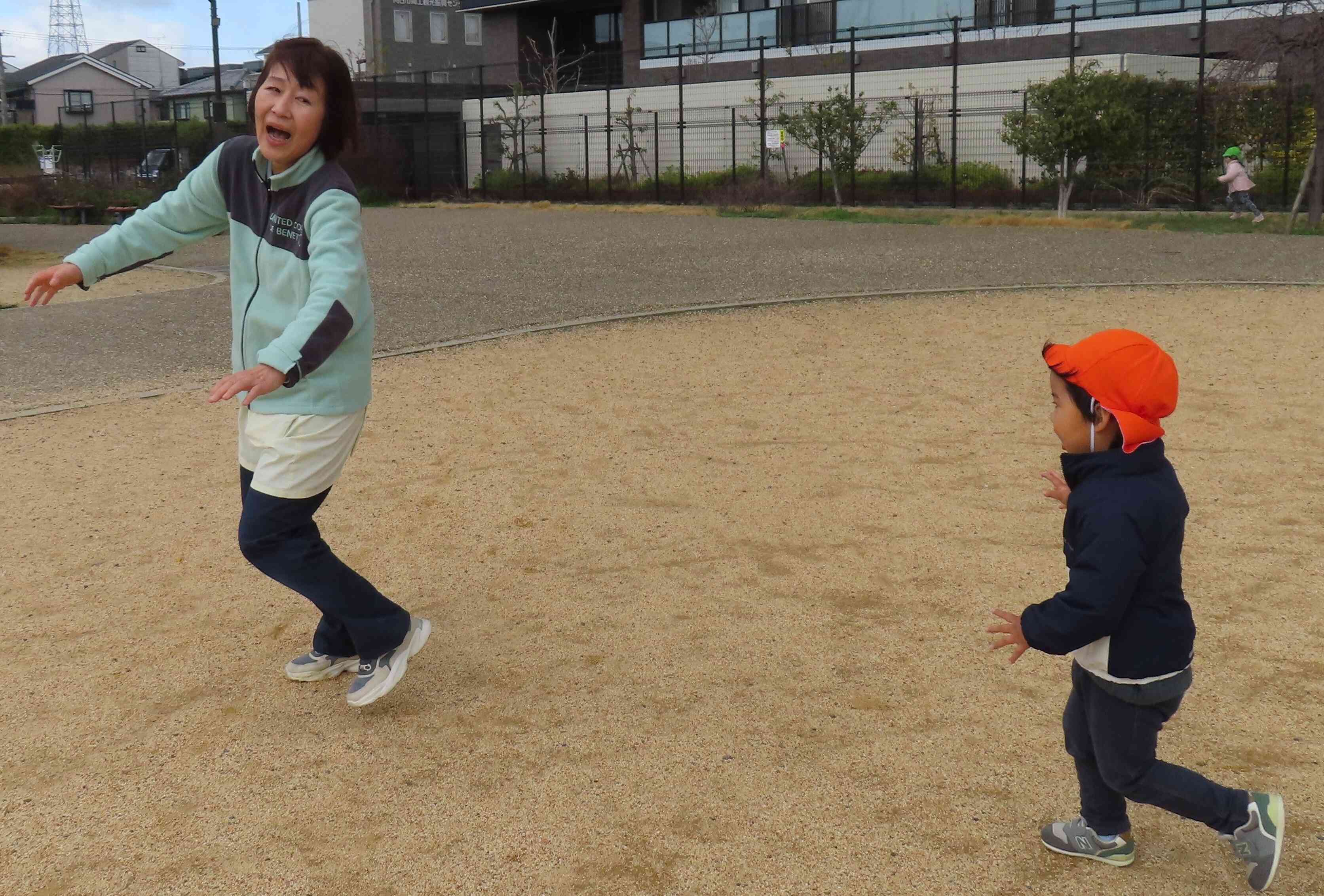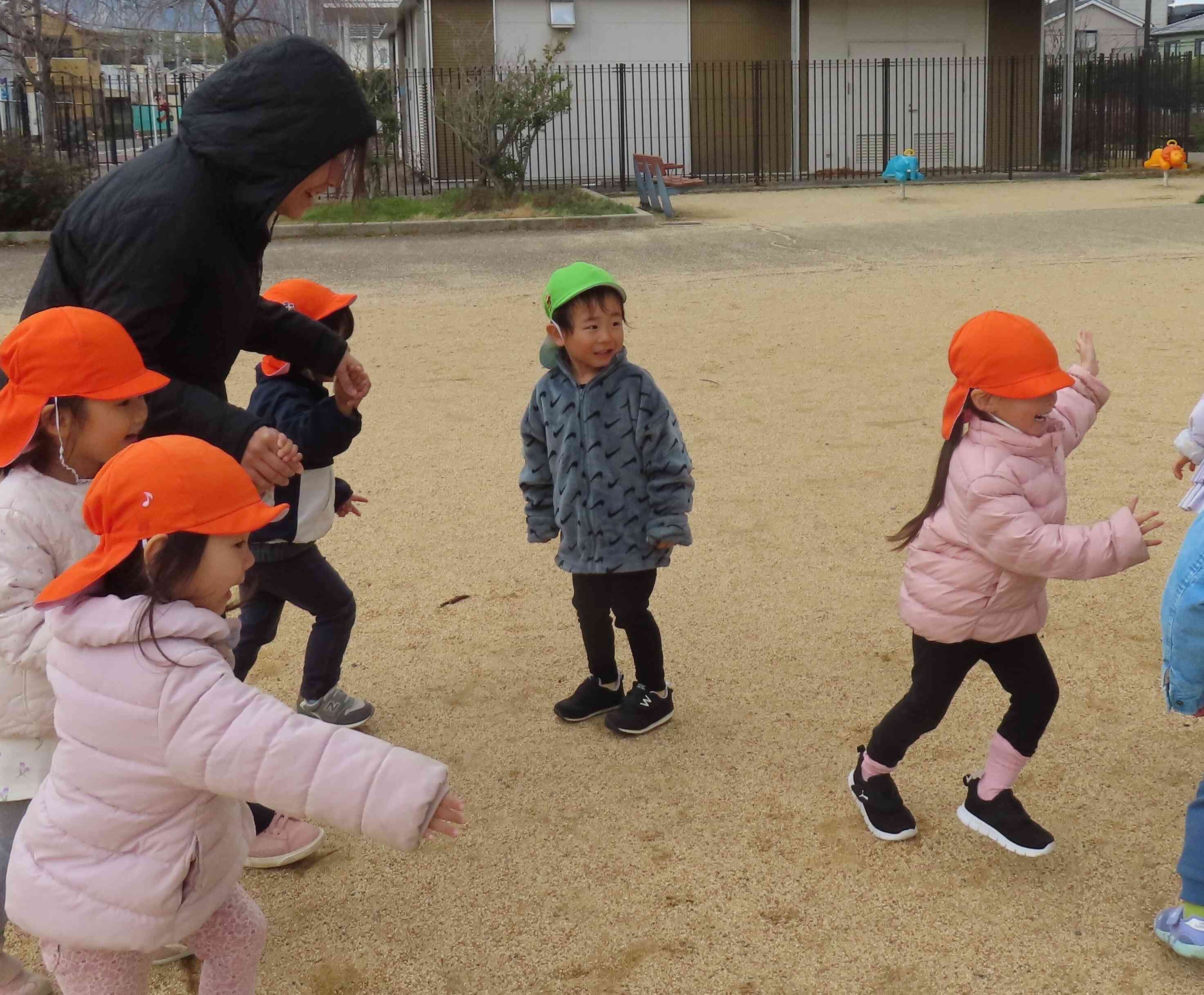 最初は恥ずかしくて一緒に手をつなぐのもソワソワしていたお友だちもいましたが、少しずつ距離をつめていくことができましたよ。この日もいっしょに“はないちもんめ”を楽しみました(*^-^*)