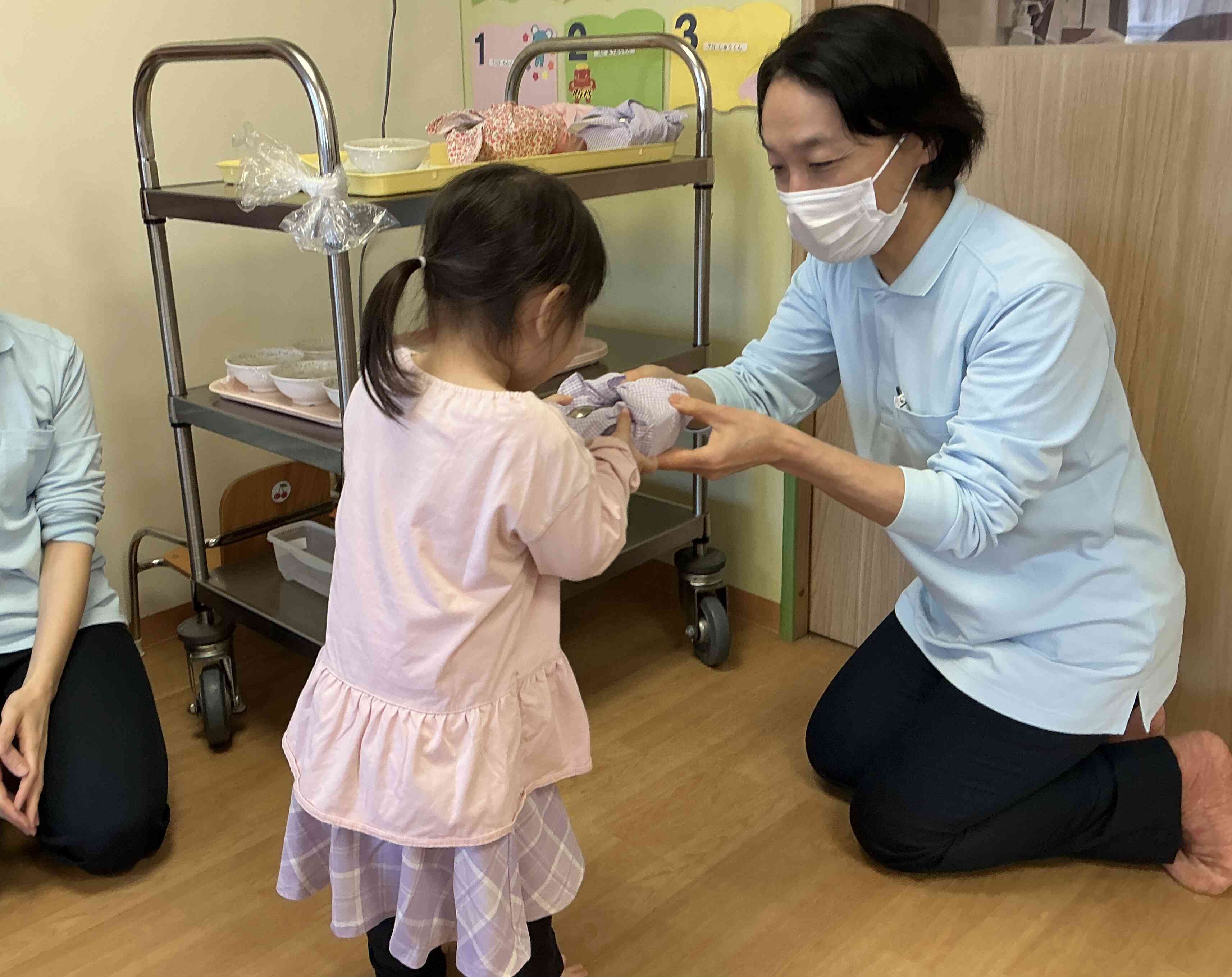 うさぎ組さんはランチクロスに包まれたお弁当箱を1人ずつ給食の先生から手渡してもらいました(*^-^*)