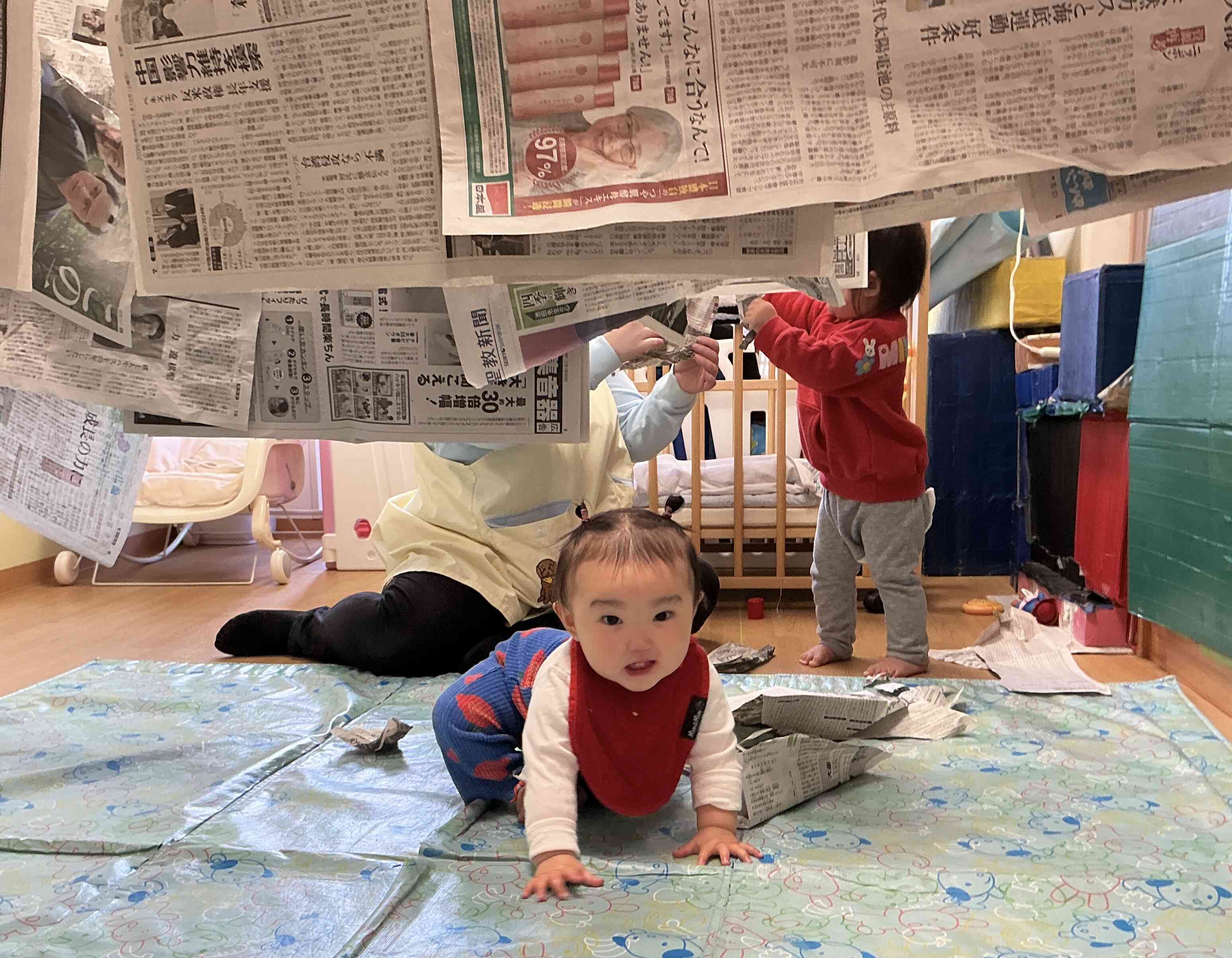 一番月齢の小さなお友だちは、新聞紙カーテンの下をハイハイで潜り抜けて遊んでいました。