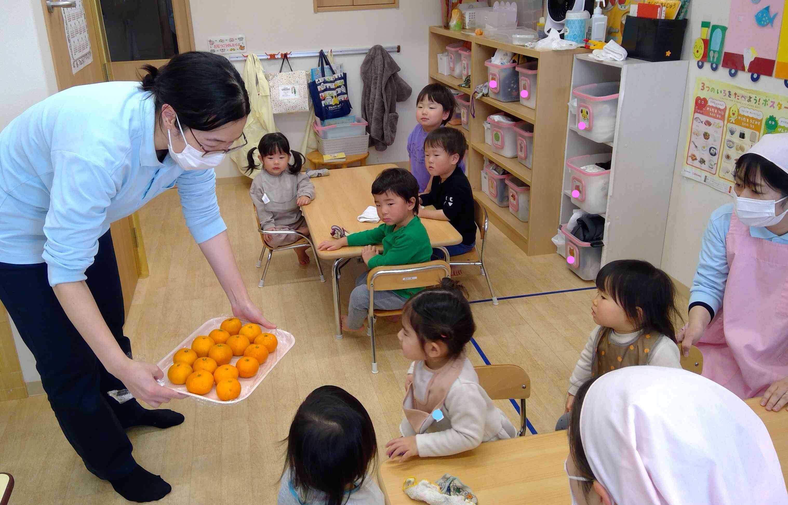 普段の給食では半分に切っていたり皮をむいて提供しているみかんですが、今日は丸ごと配ってもらいました(^^)/