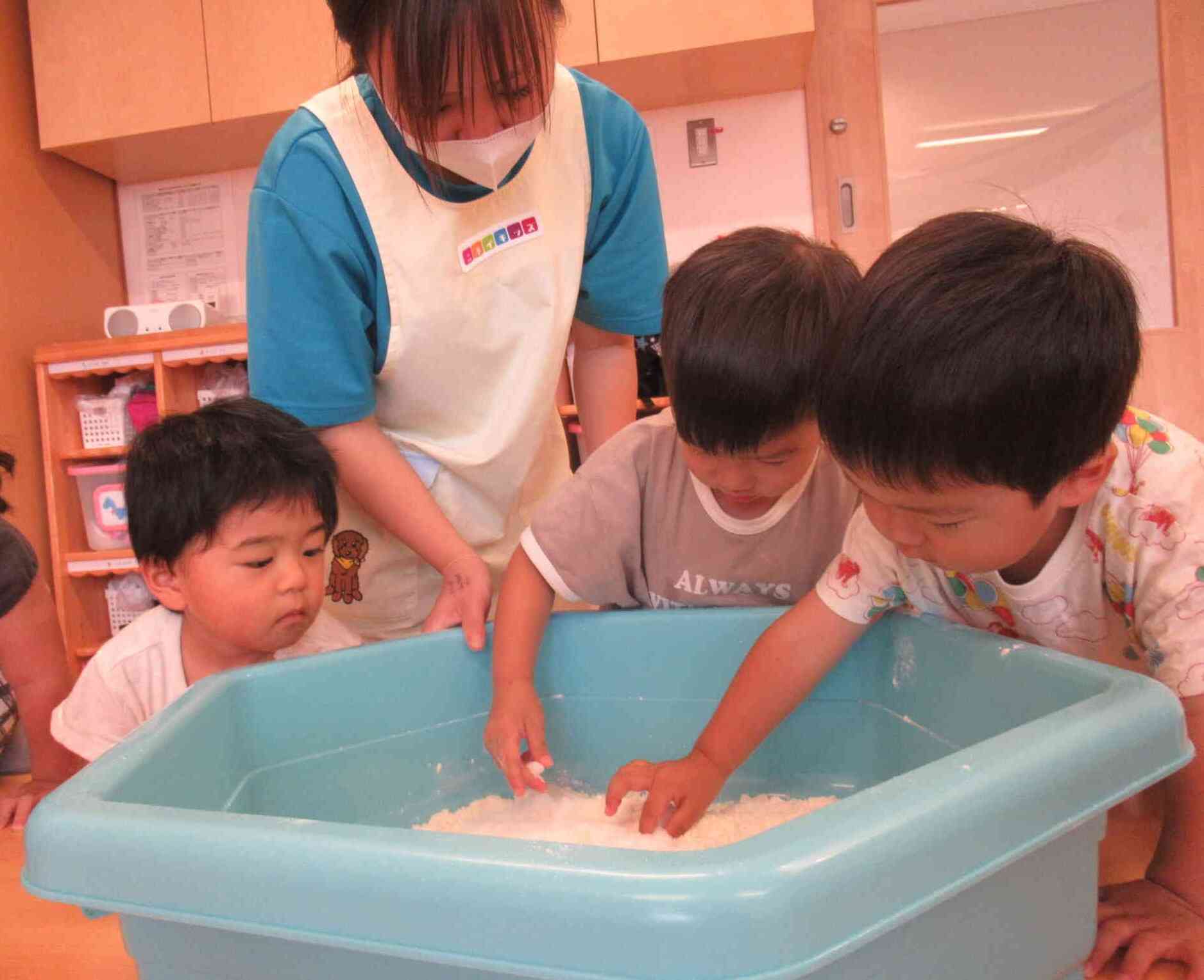実際に触れてみることで「さらさら!」「手にくっつくね!」と感じたことを言葉にしていました。