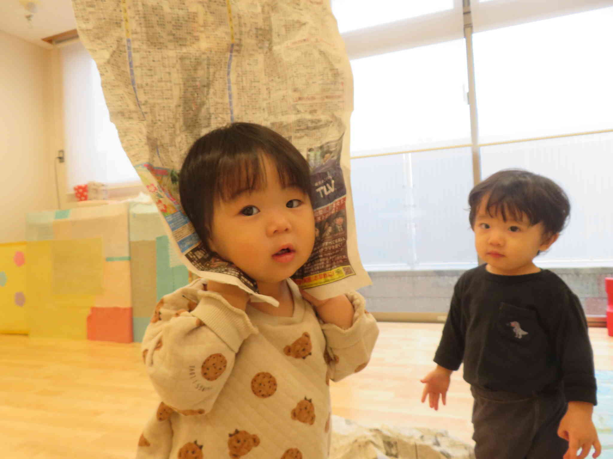 この日は新聞紙をビリビリと破ることを楽しんだり、トンネルを見つけると上手にハイハイでくぐったりしています!!