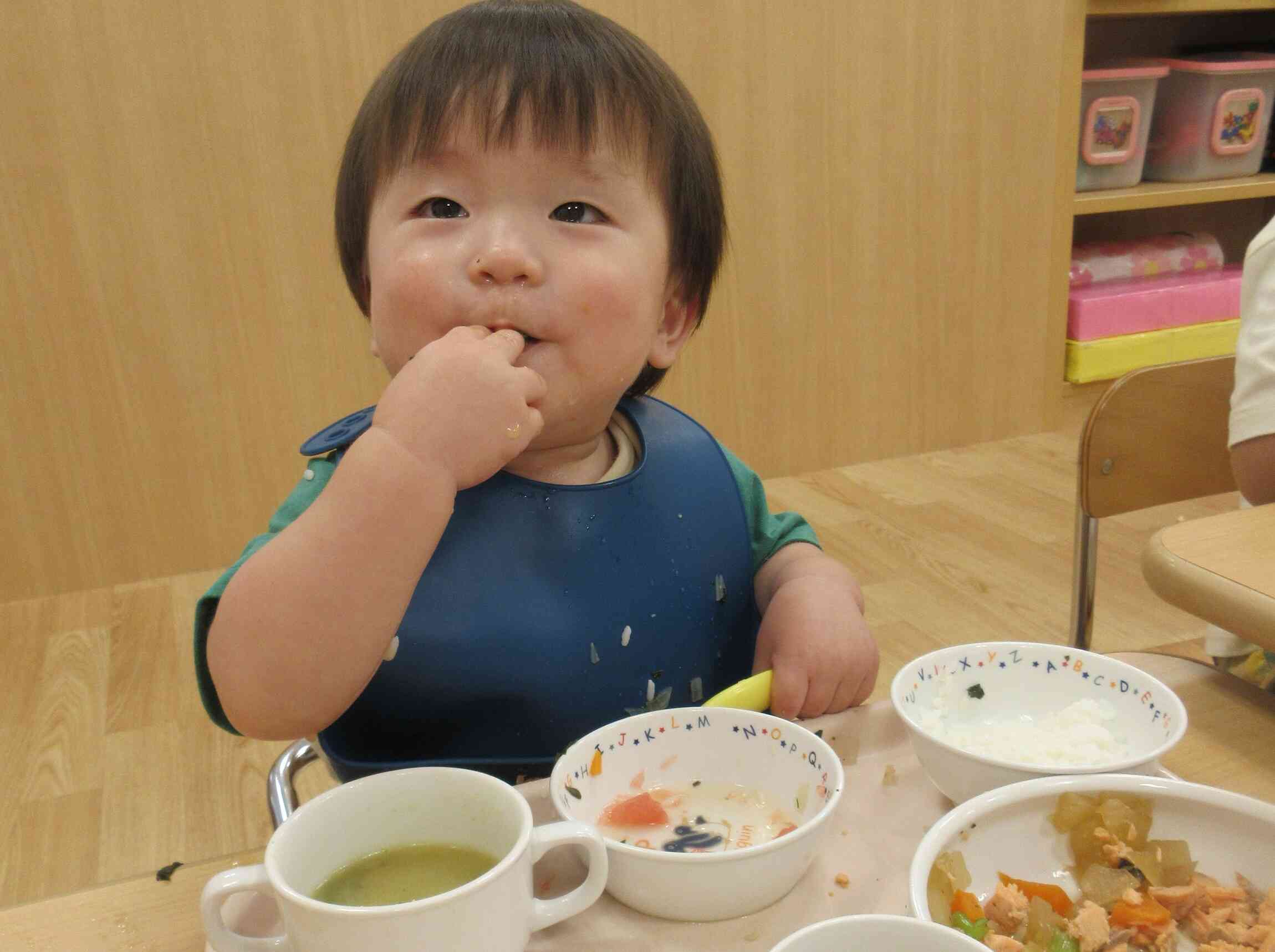 ひよこ組さんもにこにこおいしく給食を食べています♪