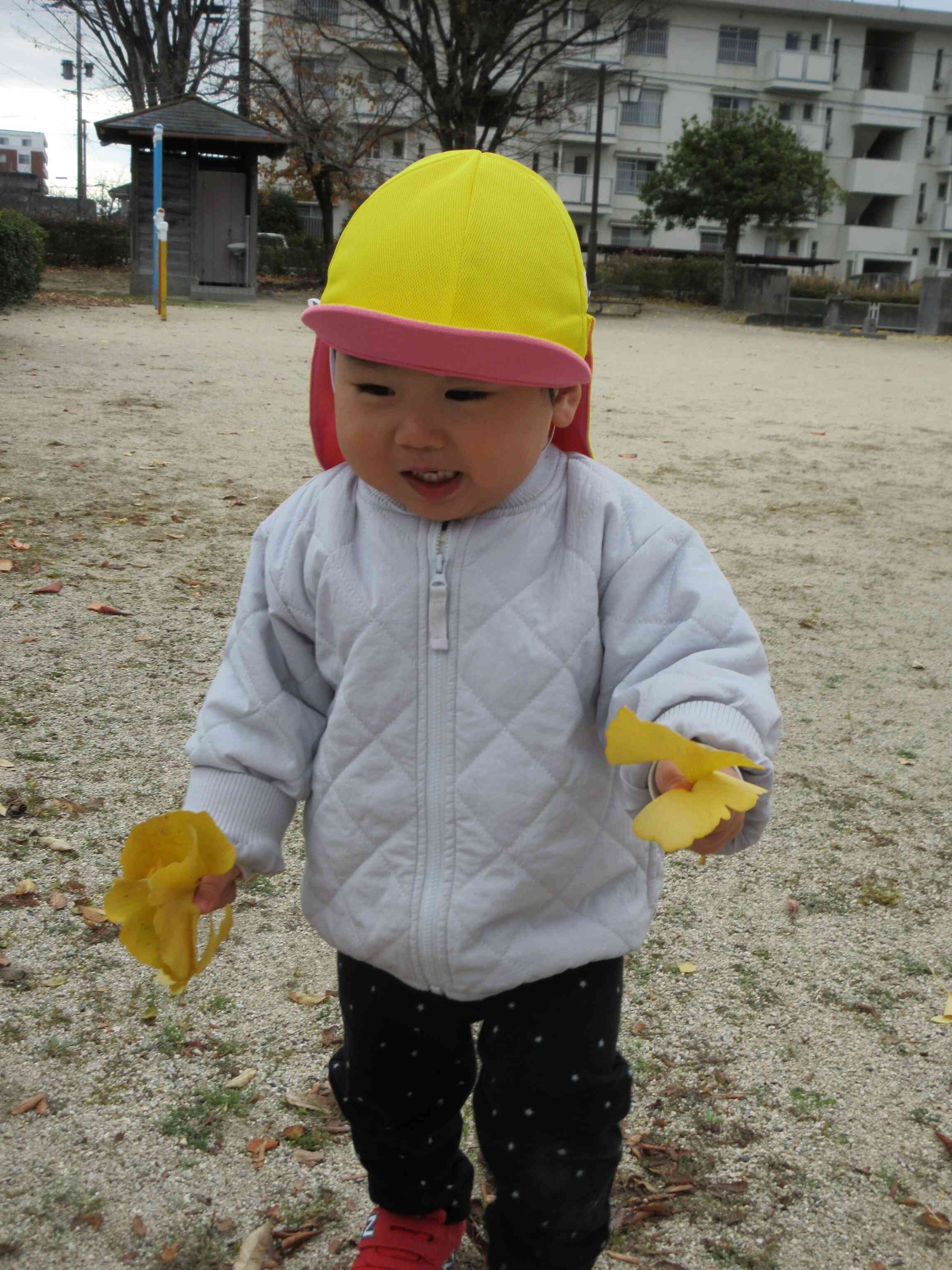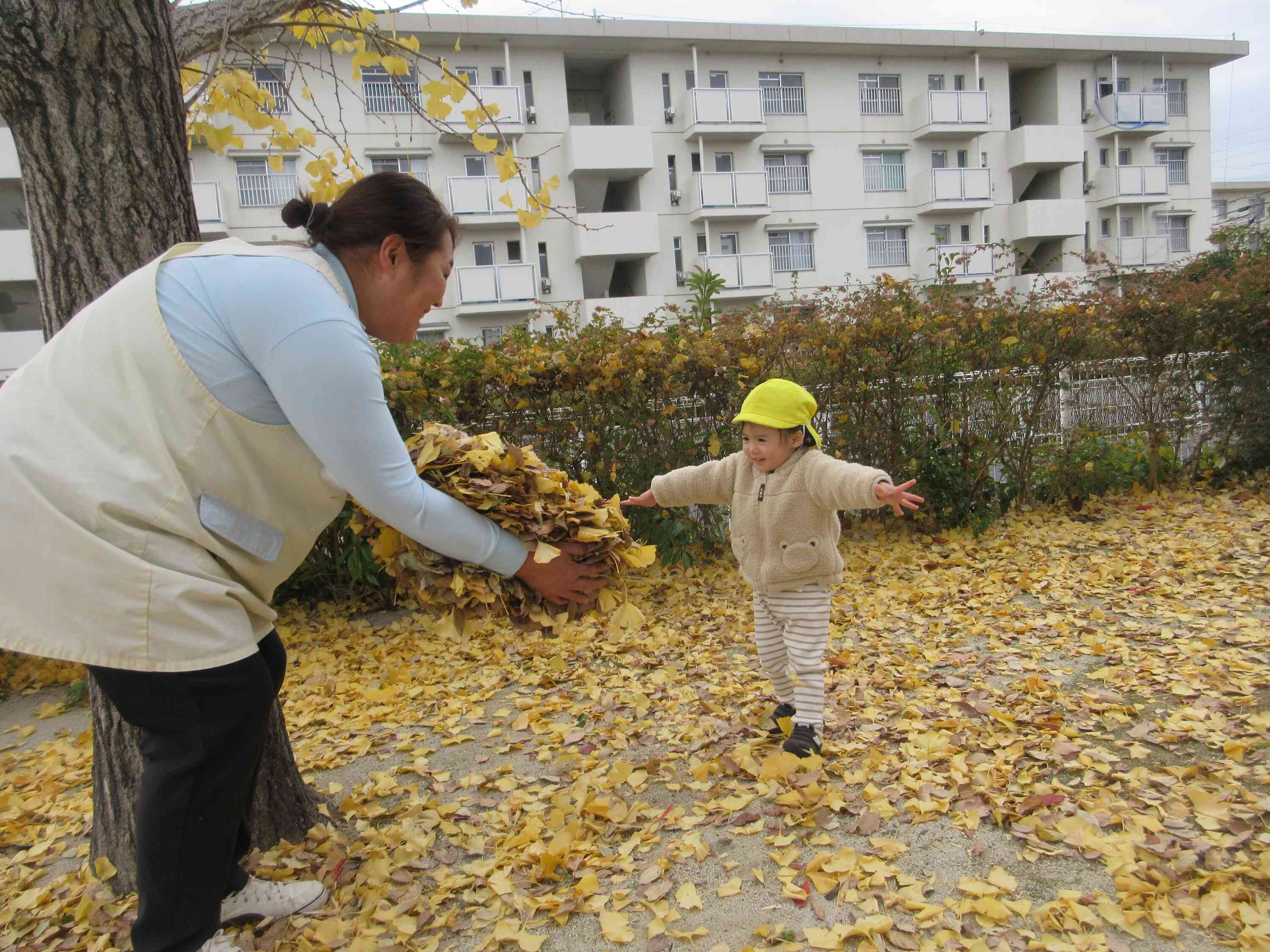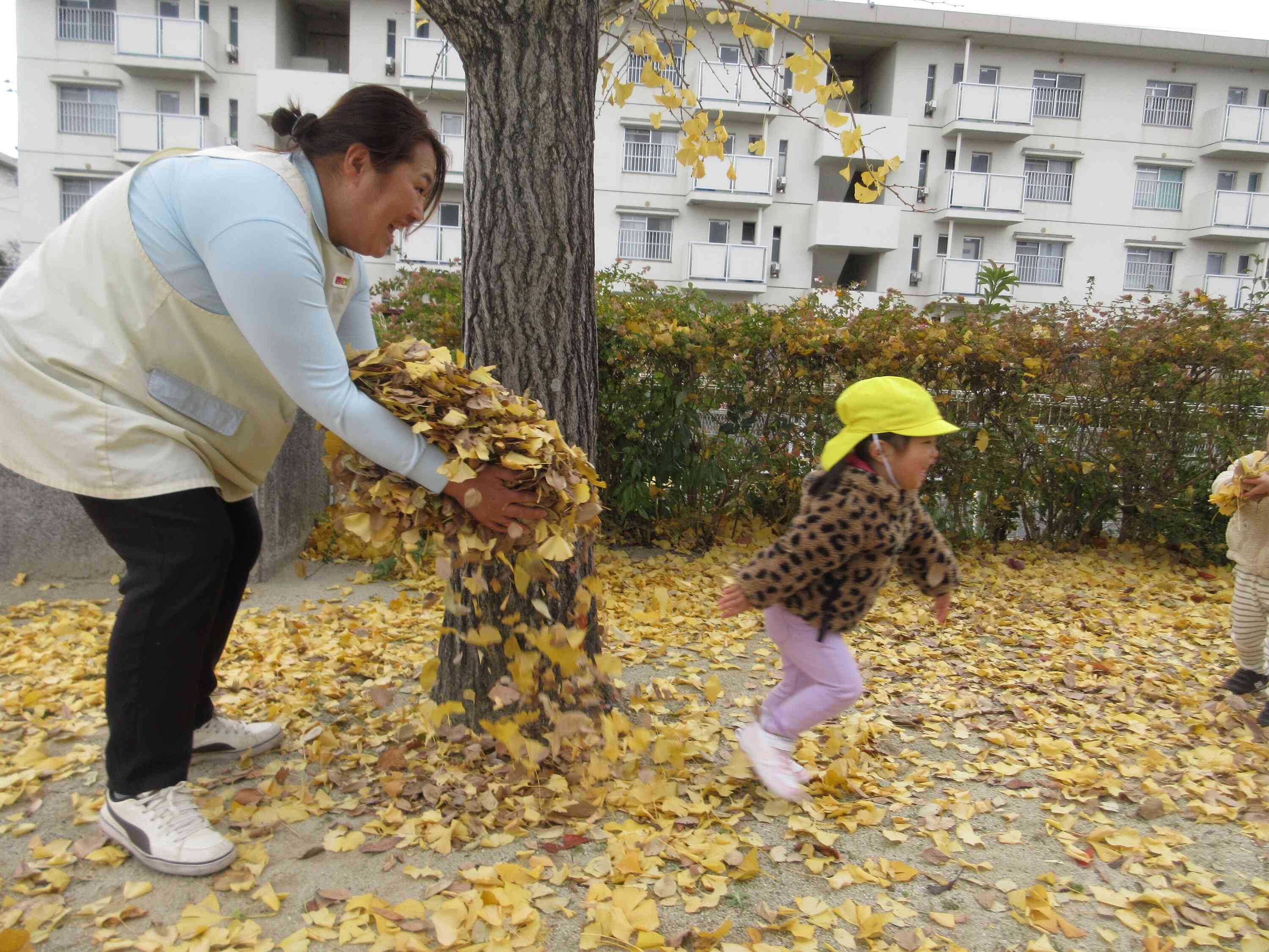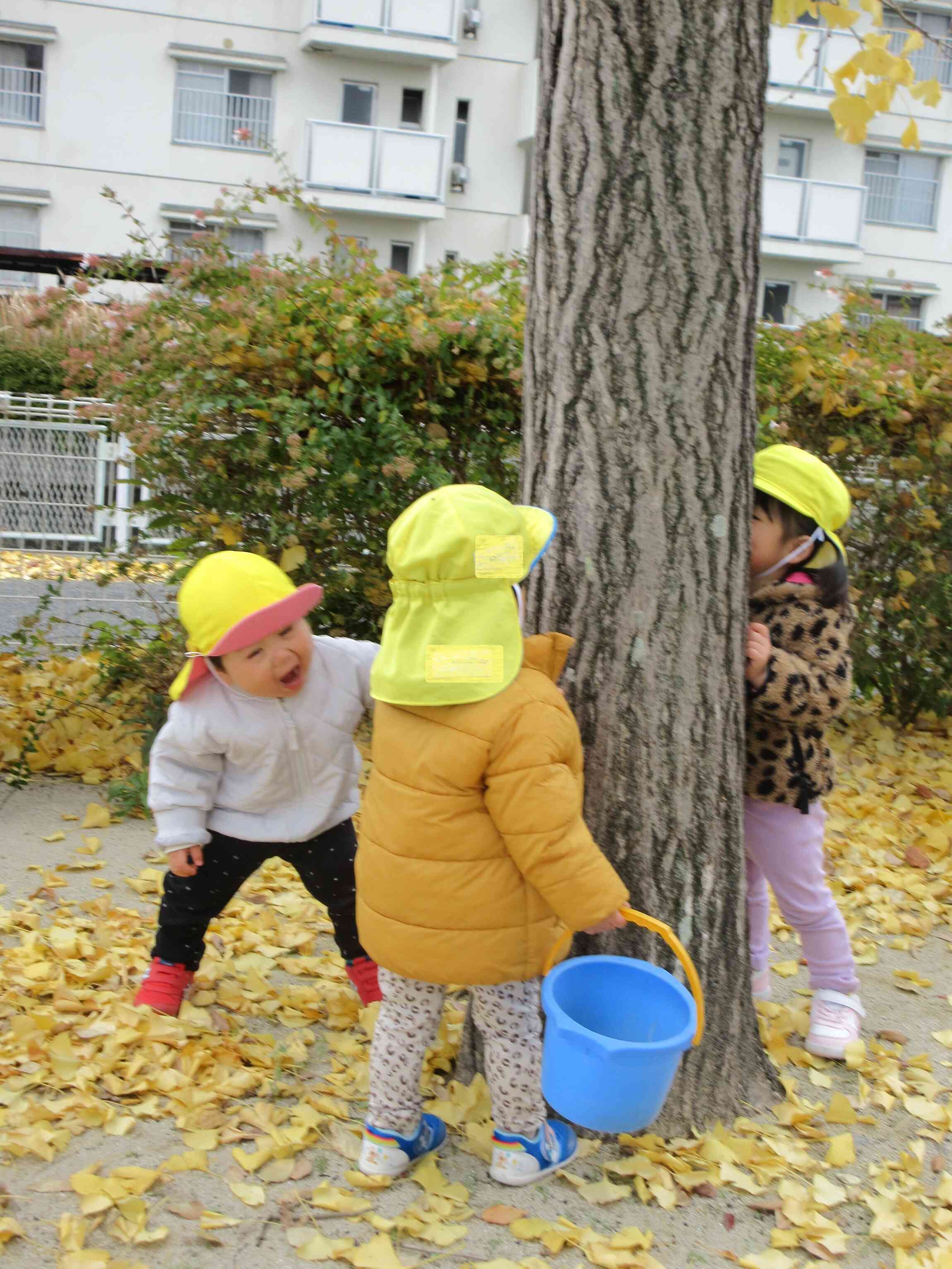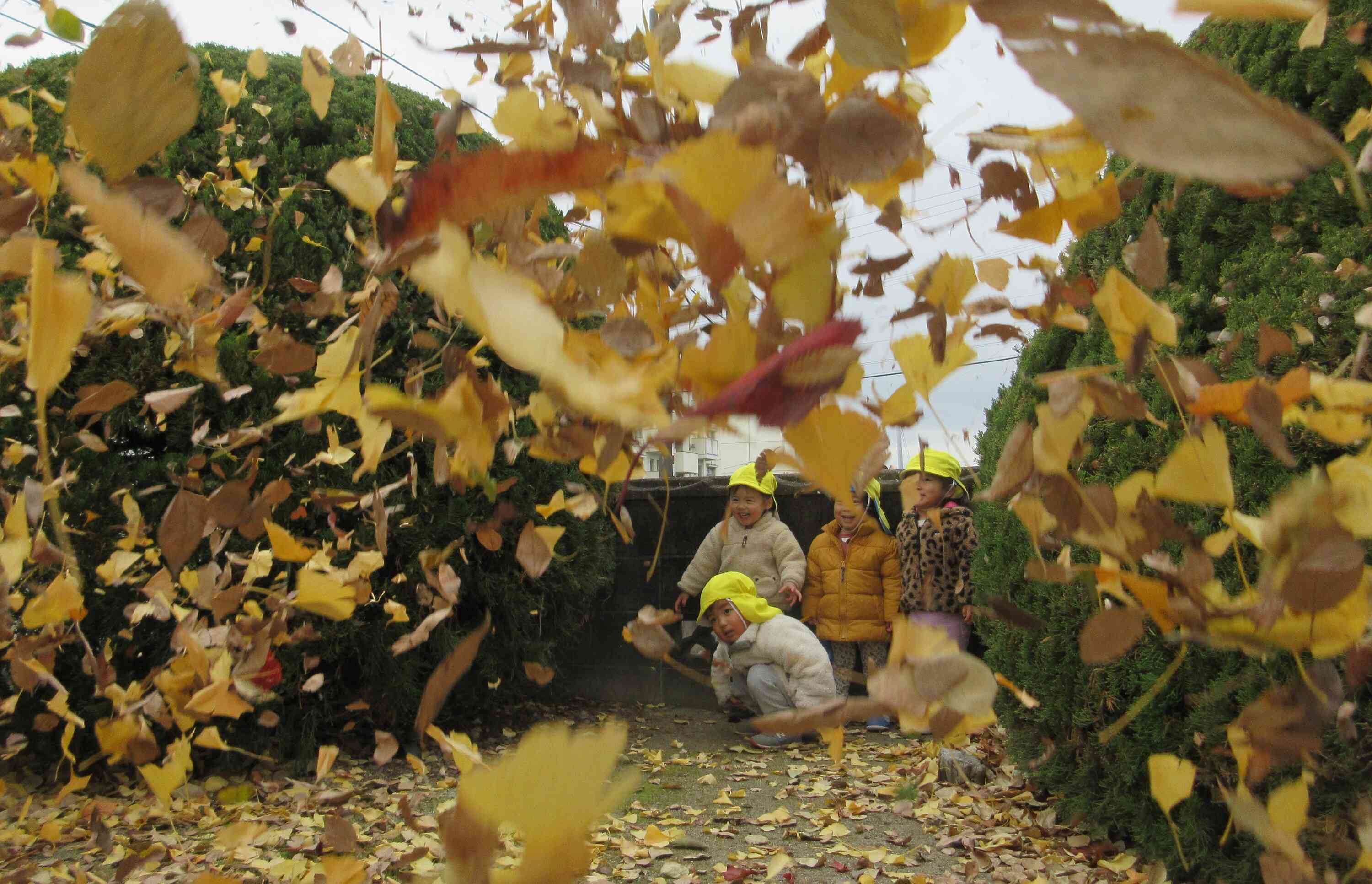 先生がたくさんの落ち葉を持って追いかけてくるのが楽しく、木の間に隠れてみたり、