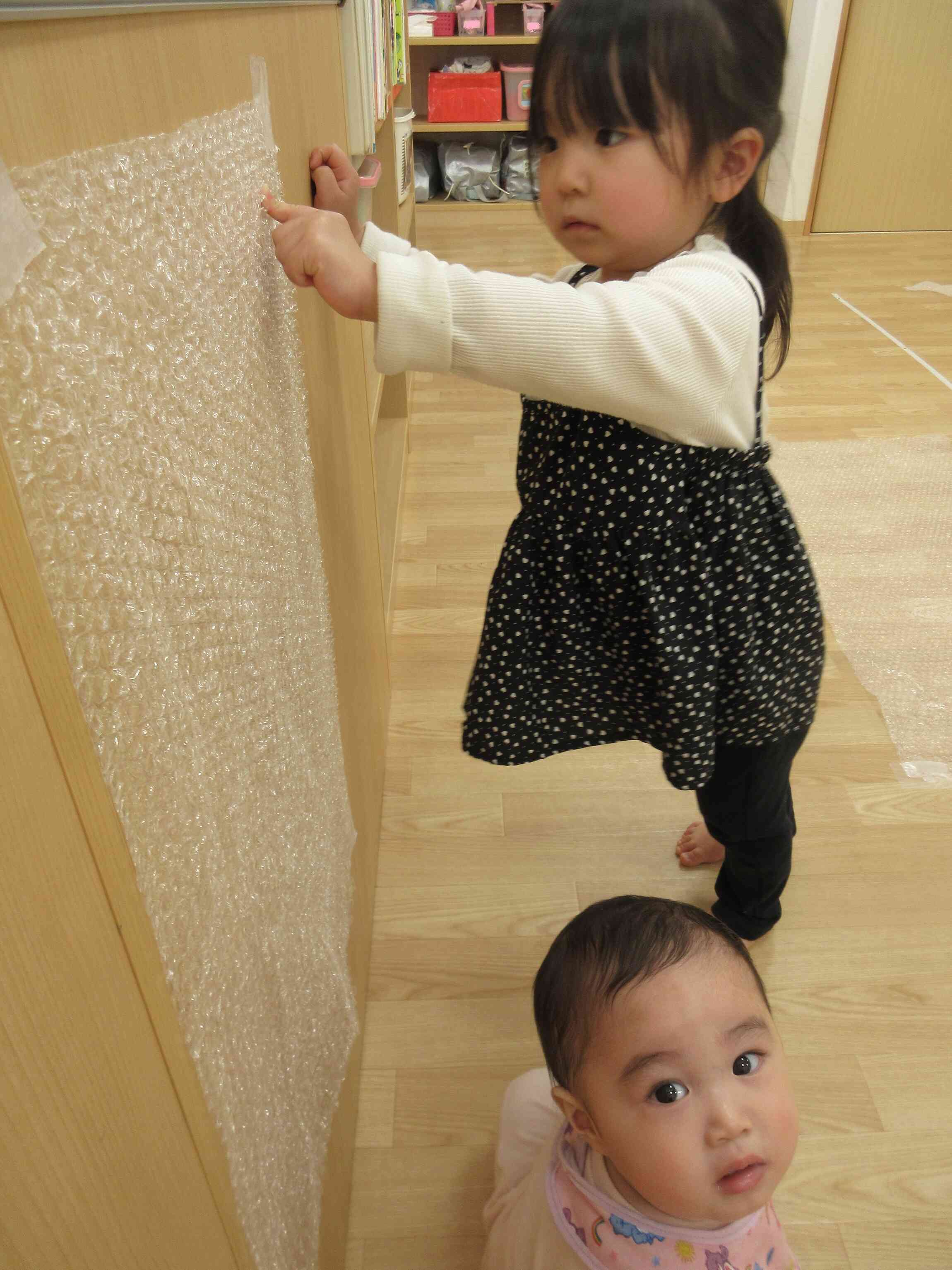 壁に張った緩衝材をプチプチ!と音の慣らして楽しんでいました♪