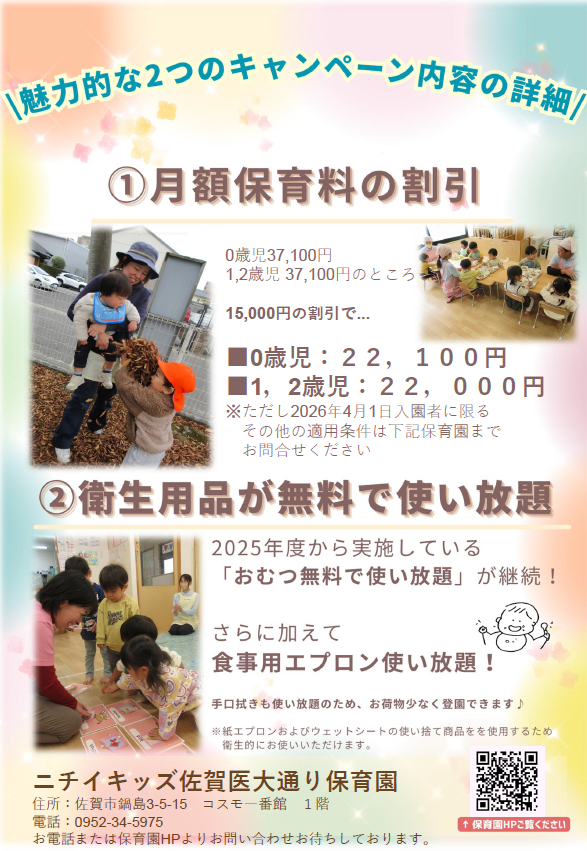 保育料の割引:2026年2月28日までに継続決定・専願(2026年4月1日入園)での申込の提出となります。
