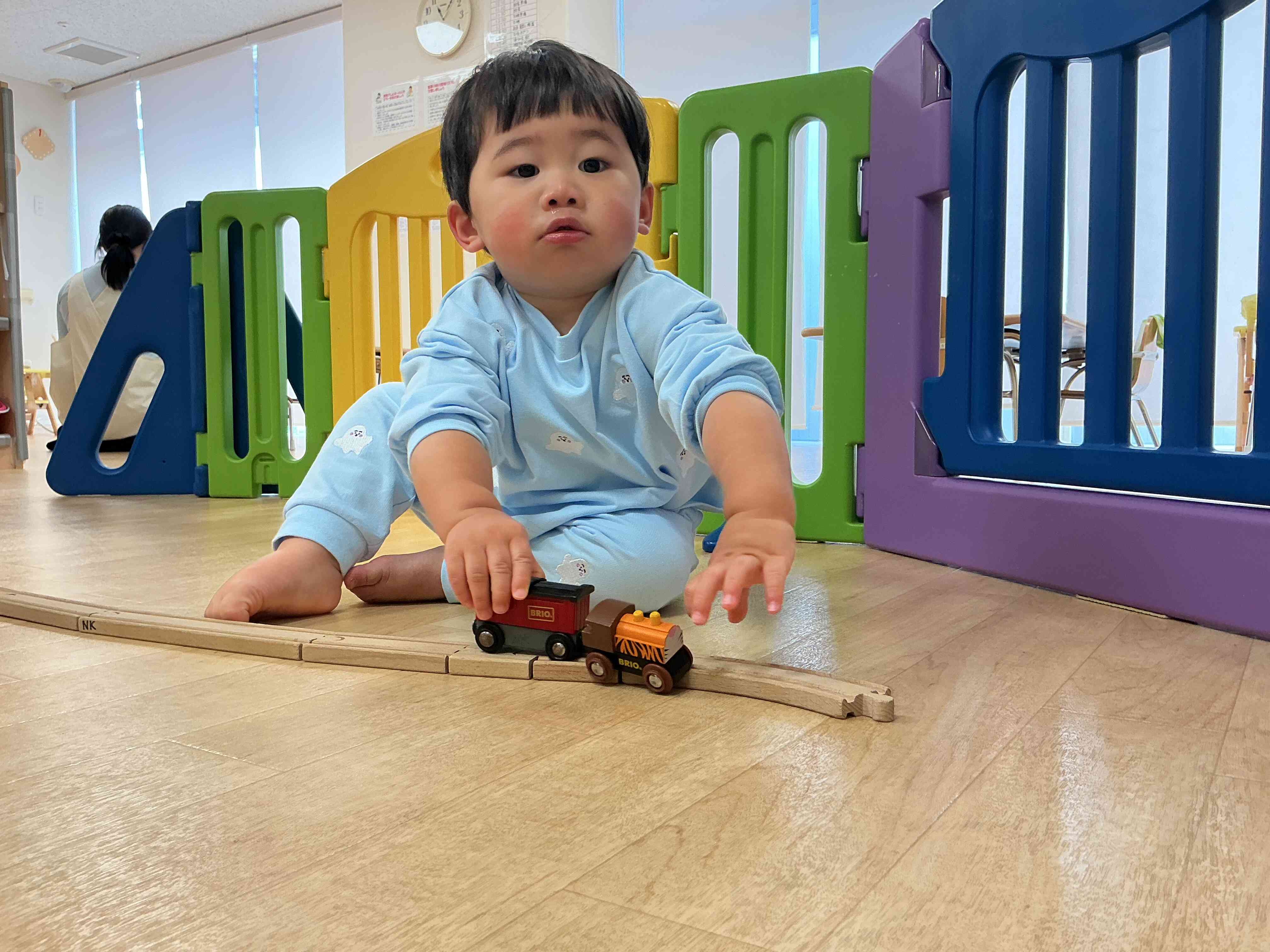 散歩でたくさん身体を動かした後は、お部屋で電車遊びをしました。