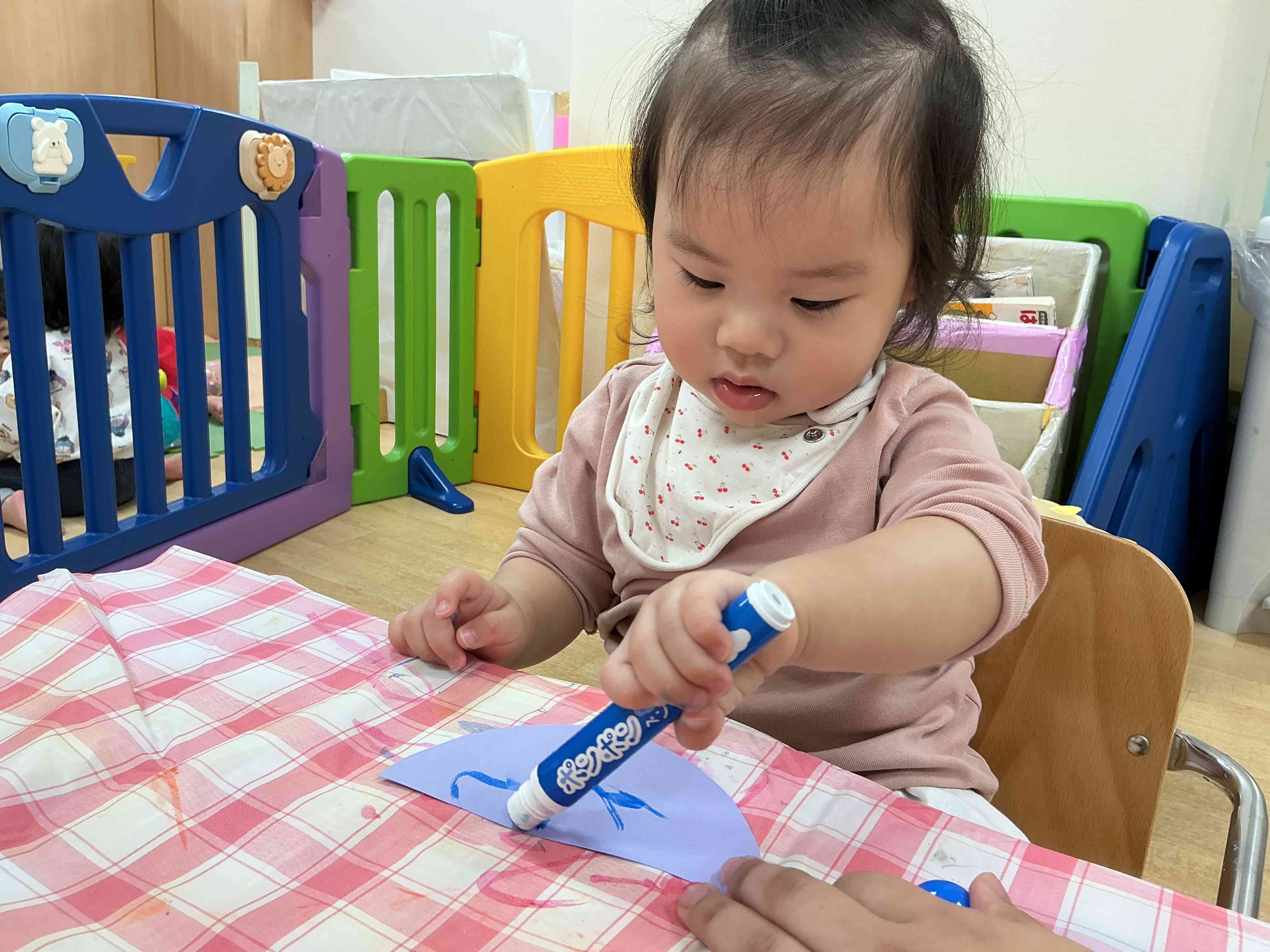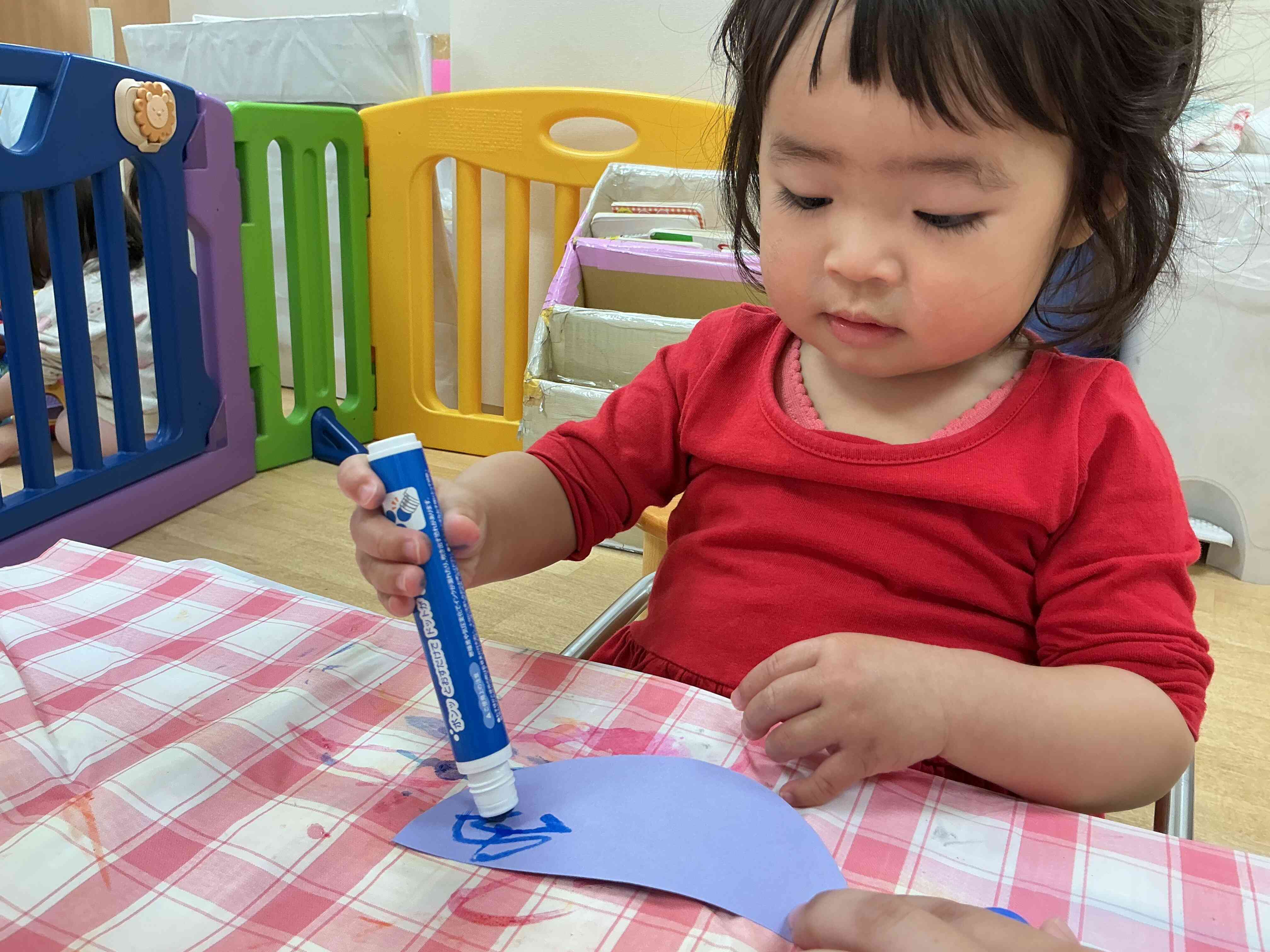 今日はひよこ組さんは制作をしました。画用紙にペンでお絵描きをしたりスタンプをしたりと楽しそうにしていましたよ。