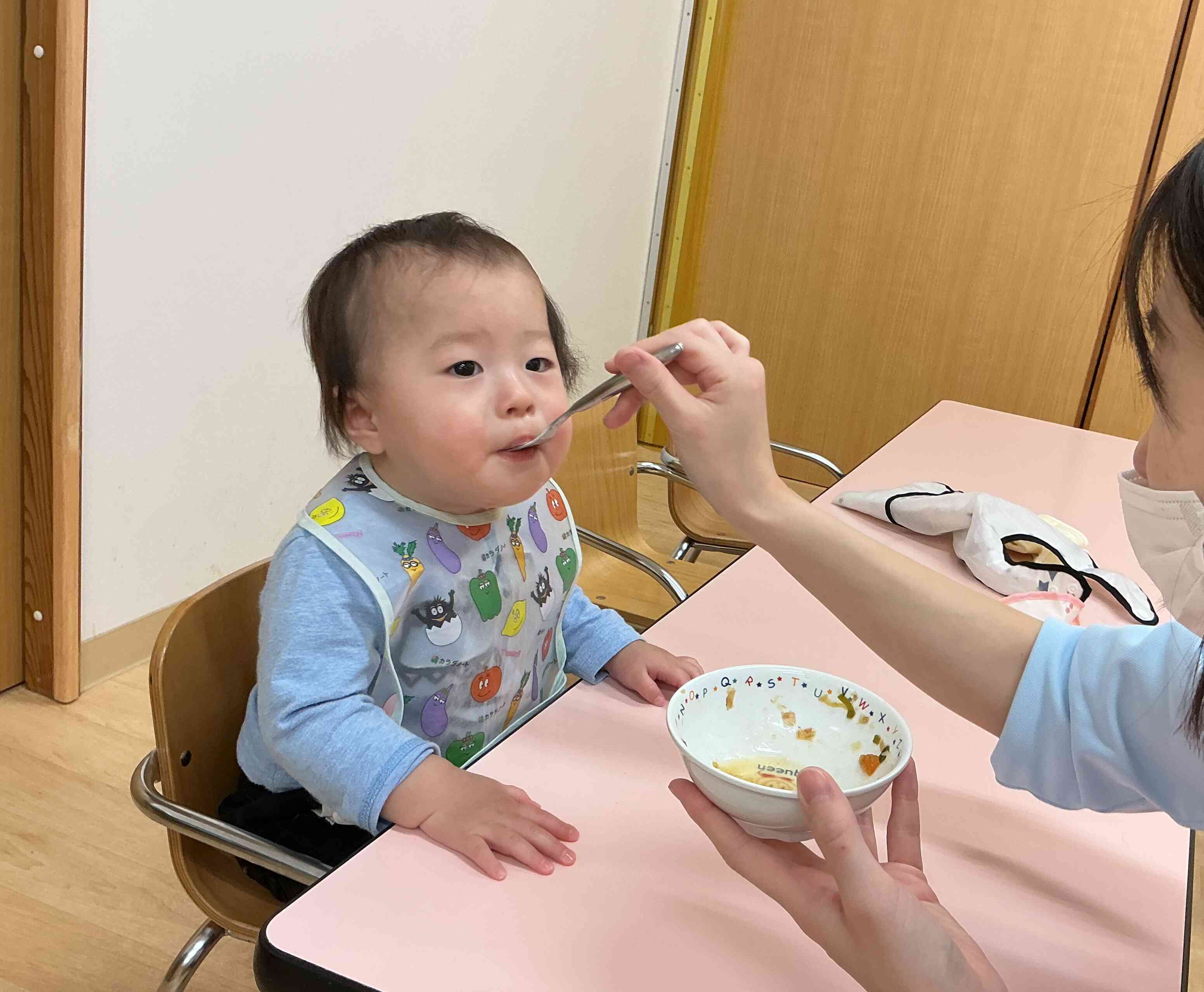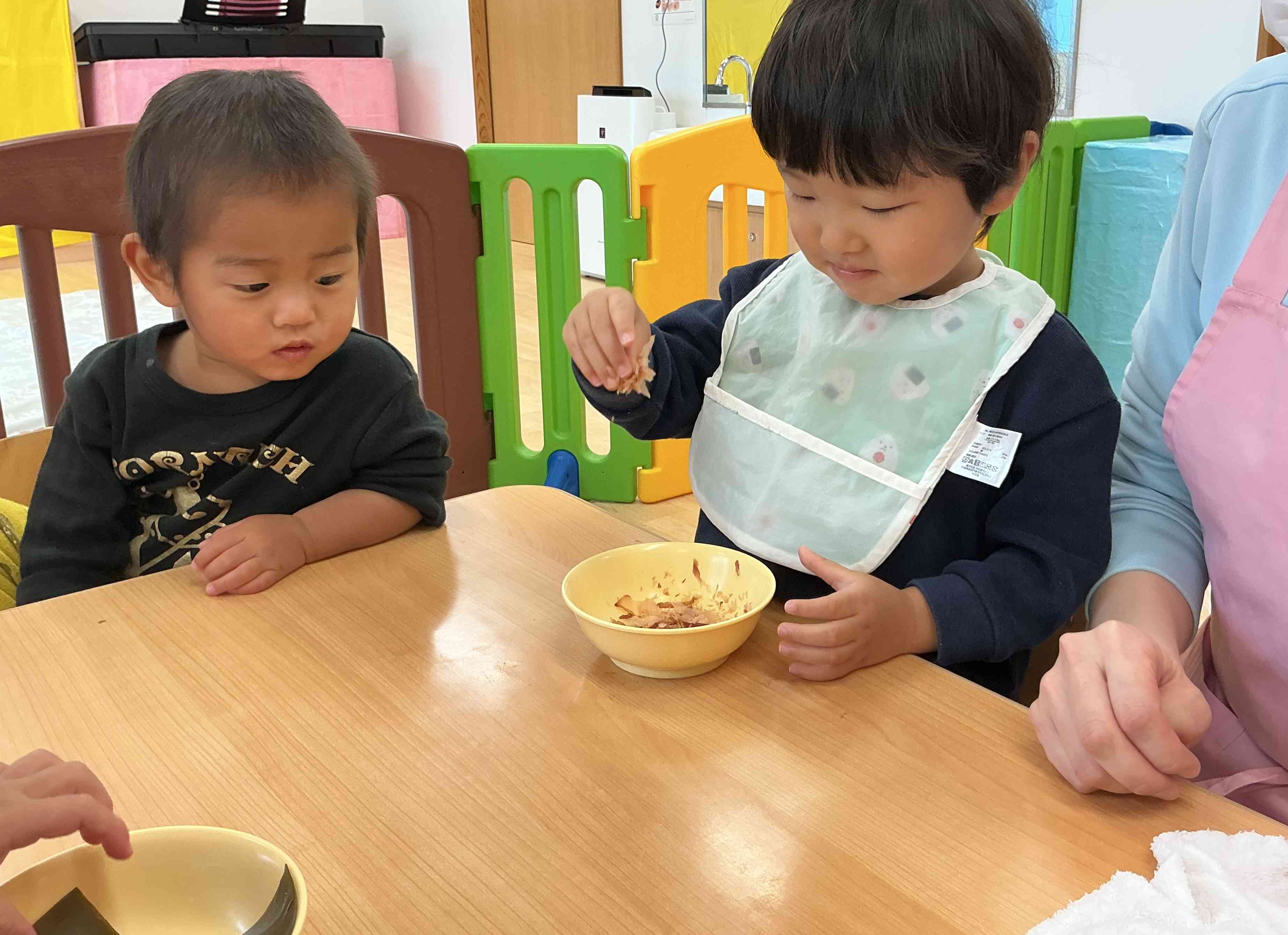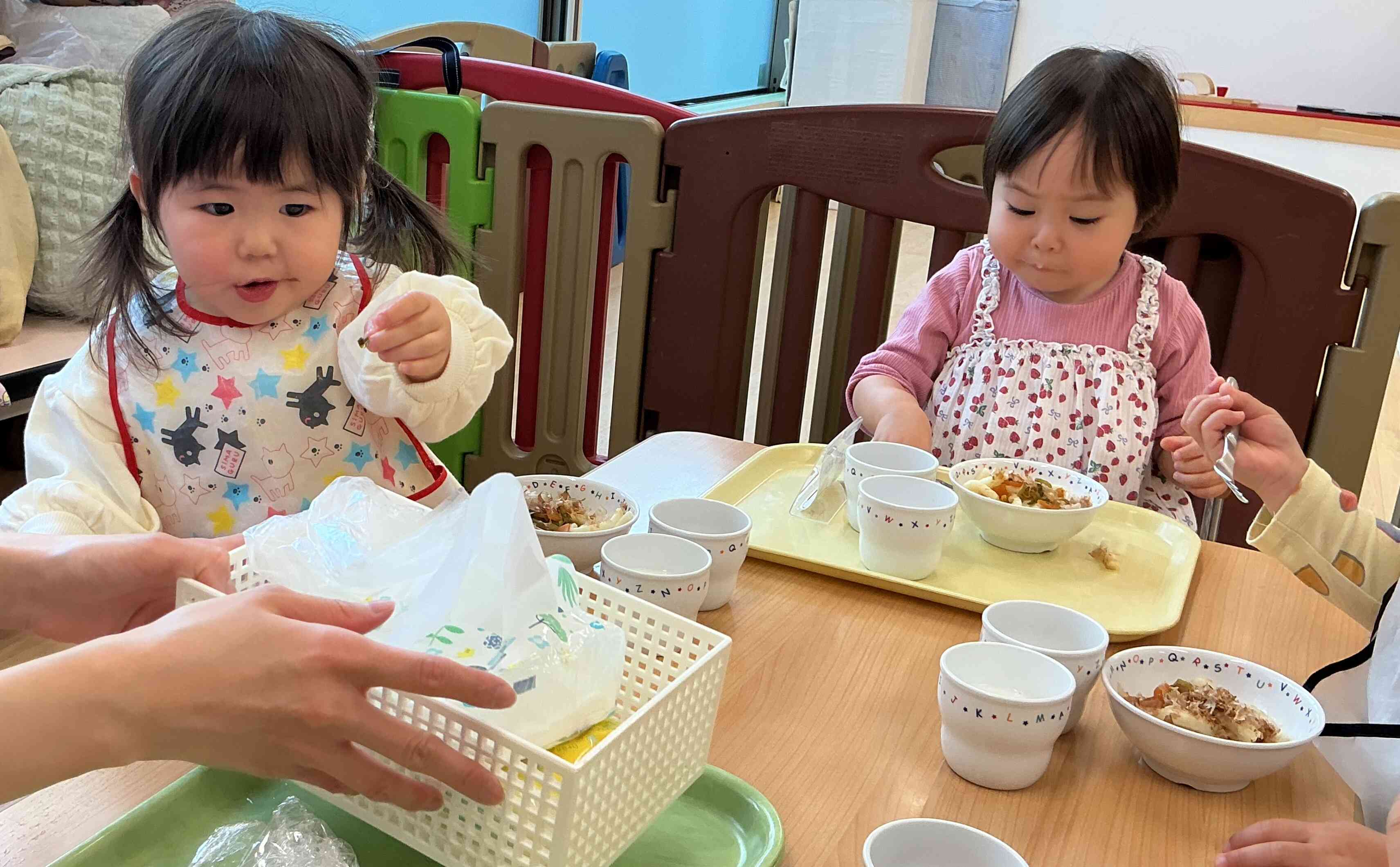 0歳児さん達も、短く切ってもらったうどんをぱくぱく❤